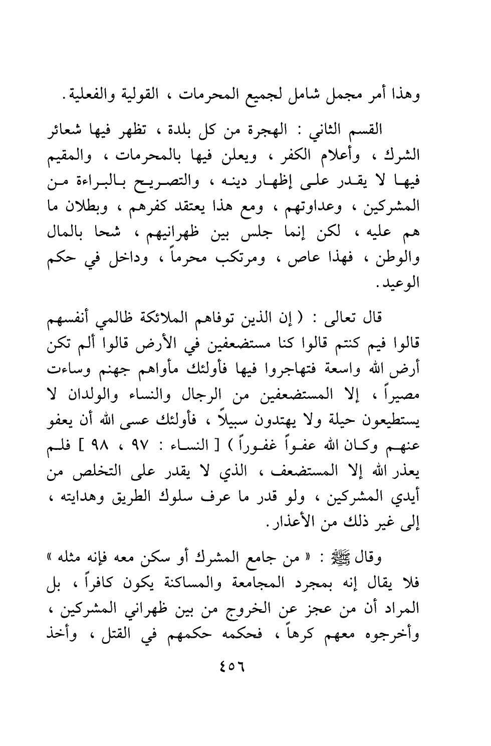 القسم الثاني: الهجرة من كل بلدة تظهر فيها شعائر الشرك وأعلام الكفر، ويعلن فيها بالمحرمات، والمقيم فيها لا يقدر على إظهار دينه، والتصريح بالبراءة من المشركين وعداوتهم، ومع هذا يعتقد كفرهم، وبطلان ما هم عليه، لكن إنما جلس بين ظهرانيهم، شحاً بالمال والوطن، فهذا عاص، ومرتكب محرماً، وداخل في حكم الوعيد. قال تعالى: {إِنَّ الَّذِينَ تَوَفَّاهُمُ الْمَلائِكَةُ ظَالِمِي أَنْفُسِهِمْ قَالُوا فِيمَ كُنْتُمْ قَالُوا كُنَّا مُسْتَضْعَفِينَ فِي الْأَرْضِ قَالُوا أَلَمْ تَكُنْ أَرْضُ اللَّهِ وَاسِعَةً فَتُهَاجِرُوا فِيهَا فَأُولَئِكَ مَأْوَاهُمْ جَهَنَّمُ وَسَاءَتْ مَصِيراً إِلَّا الْمُسْتَضْعَفِينَ مِنَ الرِّجَالِ وَالنِّسَاءِ وَالْوِلْدَانِ لا يَسْتَطِيعُونَ حِيلَةً وَلا يَهْتَدُونَ سَبِيلاً فَأُولَئِكَ عَسَى اللَّهُ أَنْ يَعْفُوَ عَنْهُمْ وَكَانَ اللَّهُ عَفُوّاً غَفُوراً} [سورة النساء آية: 97-99] ، فلم يعذر الله إلا المستضعف، الذي لا يقدر على التخلص من أيدي المشركين، ولو قدر ما عرف سلوك الطريق وهدايته، إلى غير ذلك من الأعذار. وقال صلى الله عليه وسلم: " من جامع المشرك أو سكن معه، فإنه مثله " 1. فلا يقال: إنه بمجرد المجامعة والمساكنة يكون كافراً، بل المراد أن من عجز عن الخروج من بين ظهراني المشركين، وأخرجوه معهم كرهاً، فحكمه حكمهم في القتل، وأخذ