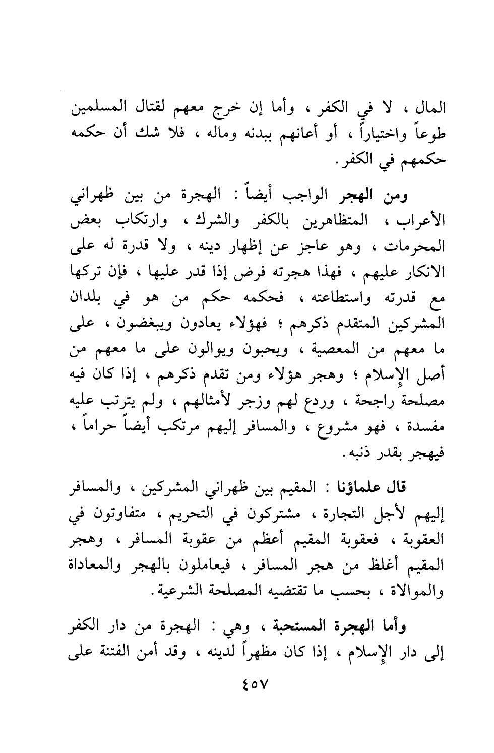 ومن الهجر الواجب أيضاً: الهجرة من بين ظهراني الأعراب المتظاهرين بالكفر والشرك، وارتكاب بعض المحرمات، وهو عاجز عن إظهار دينه، ولا قدرة له على الإنكار عليهم؛ فهذا هجرته فرض إذا قدر عليها، فإن تركها مع قدرته واستطاعته، فحكمه حكم من هو في بلدان المشركين المتقدم ذكرهم; فهؤلاء يعادَوْن ويبغَضون، على ما معهم من المعصية، ويحبون ويوالون على ما معهم من أصل الإسلام. وهجر هؤلاء ومن تقدم ذكرهم، إذا كان فيه مصلحة راجحة، وردع لهم وزجر لأمثالهم، ولم يترتب عليه مفسدة، فهو مشروع. والمسافر إليهم مرتكب أيضاً حراماً، فيهجر بقدر ذنبه. قال علماؤنا: المقيم بين ظهراني المشركين، والمسافر إليهم لأجل التجارة، مشتركون في التحريم، متفاوتون في العقوبة؛ فعقوبة المقيم أعظم من عقوبة المسافر، وهجر المقيم أغلظ من هجر المسافر، فيعامَلون بالهجر والمعاداة والموالاة، بحسب ما تقتضيه المصلحة الشرعية.