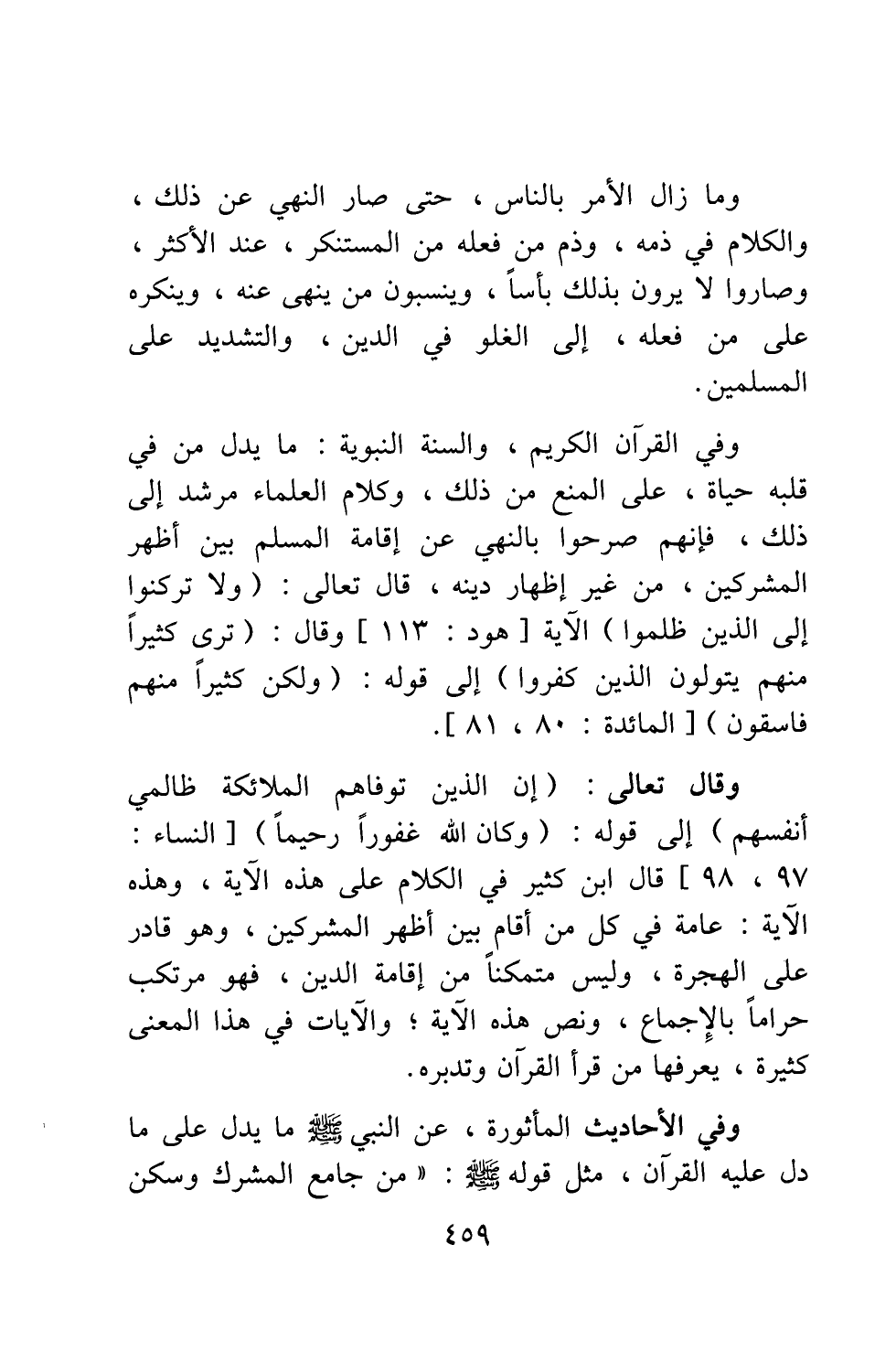 وفي القرآن الكري، والسنة النبوية، ما يدل من في قلبه حياة، على المنع من ذلك؛ وكلام العلماء مرشد إلى ذلك، فإنهم صرحوا بالنهي عن إقامة المسلم بين أظهر المشركين، من غير إظهار دينه، قال تعالى: {وَلا تَرْكَنُوا إِلَى الَّذِينَ ظَلَمُوا} الآية [سورة هود آية: 113] ، وقال: {تَرَى كَثِيراً مِنْهُمْ يَتَوَلَّوْنَ الَّذِينَ كَفَرُوا} إلى قوله: {وَلَكِنَّ كَثِيراً مِنْهُمْ فَاسِقُونَ} [سورة المائدة آية: 80-81] وقال تعالى: {إِنَّ الَّذِينَ تَوَفَّاهُمُ الْمَلائِكَةُ ظَالِمِي أَنْفُسِهِمْ} إلى قوله: {وَكَانَ اللَّهُ غَفُوراً رَحِيماً} [سورة النساء آية: 97-99] . قال ابن كثير في الكلام على هذه الآية: وهذه الآية عامة في كل من أقام بين أظهر المشركين، وهو قادر على الهجرة، وليس متمكناً من إقامة الدين؛ فهو مرتكب حراماً بالإجماع، ونص هذه الآية. والآيات في هذا المعنى كثيرة، يعرفها من قرأ القرآن وتدبره.