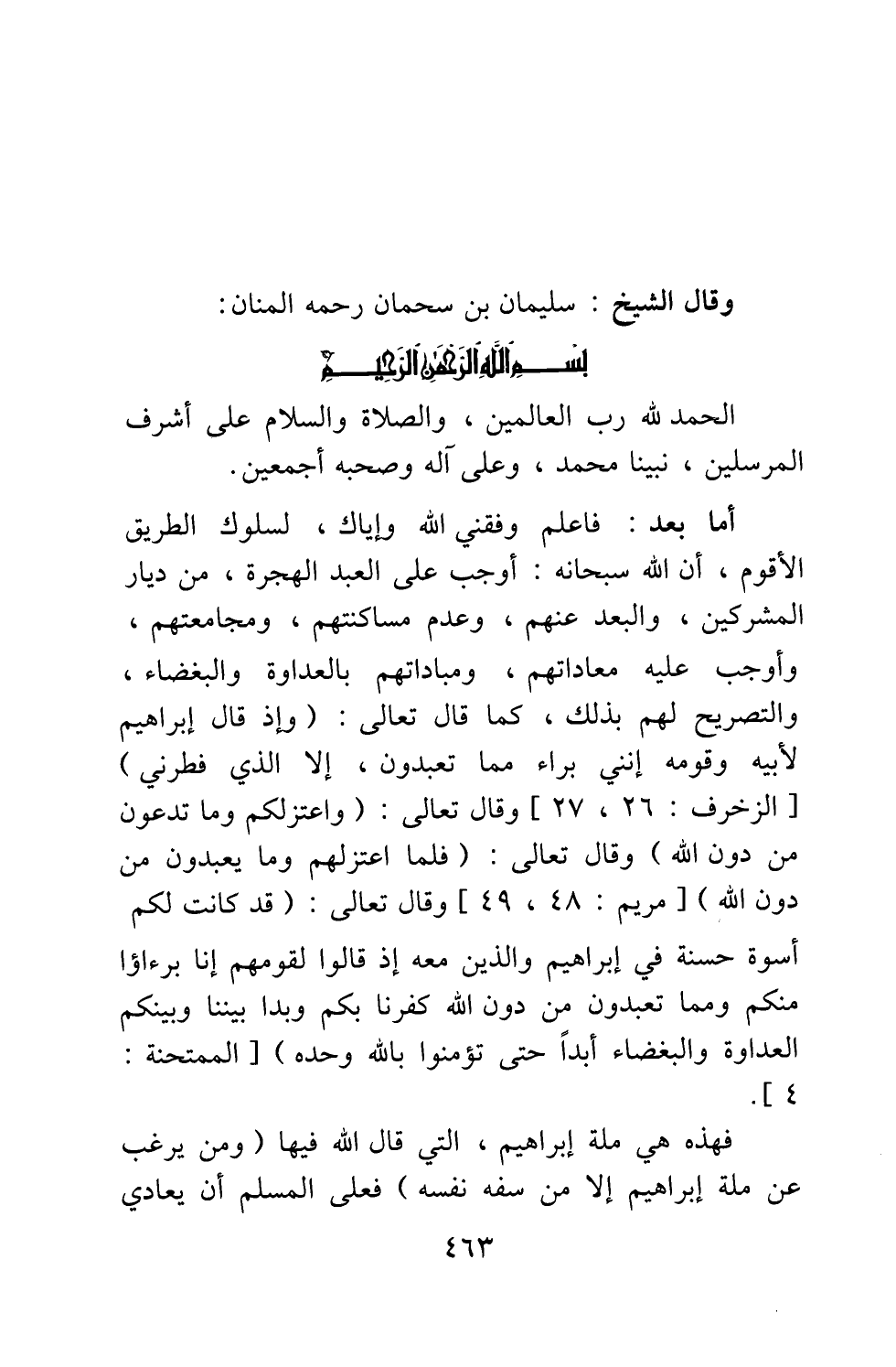 أما بعد، فاعلم، وفقني الله وإياك، لسلوك الطريق الأقوم، أن الله سبحانه أوجب على العبد الهجرة من ديار المشركين، والبعد عنهم، وعدم مساكنتهم ومجامعتهم، وأوجب عليه معاداتهم، ومباداتهم بالعداوة والبغضاء، والتصريح لهم بذلك، كما قال تعالى: {وَإِذْ قَالَ إِبْرَاهِيمُ لِأَبِيهِ وَقَوْمِهِ إِنَّنِي بَرَاءٌ مِمَّا تَعْبُدُونَ إِلَّا الَّذِي فَطَرَنِي} [سورة الزخرف آية: 26-27] وقال تعالى: {وَأَعْتَزِلُكُمْ وَمَا تَدْعُونَ مِنْ دُونِ اللَّهِ} [سورة مريم آية: 48] ، وقال تعالى: {فَلَمَّا اعْتَزَلَهُمْ وَمَا يَعْبُدُونَ مِنْ دُونِ اللَّهِ} [سورة مريم آية: 49] .