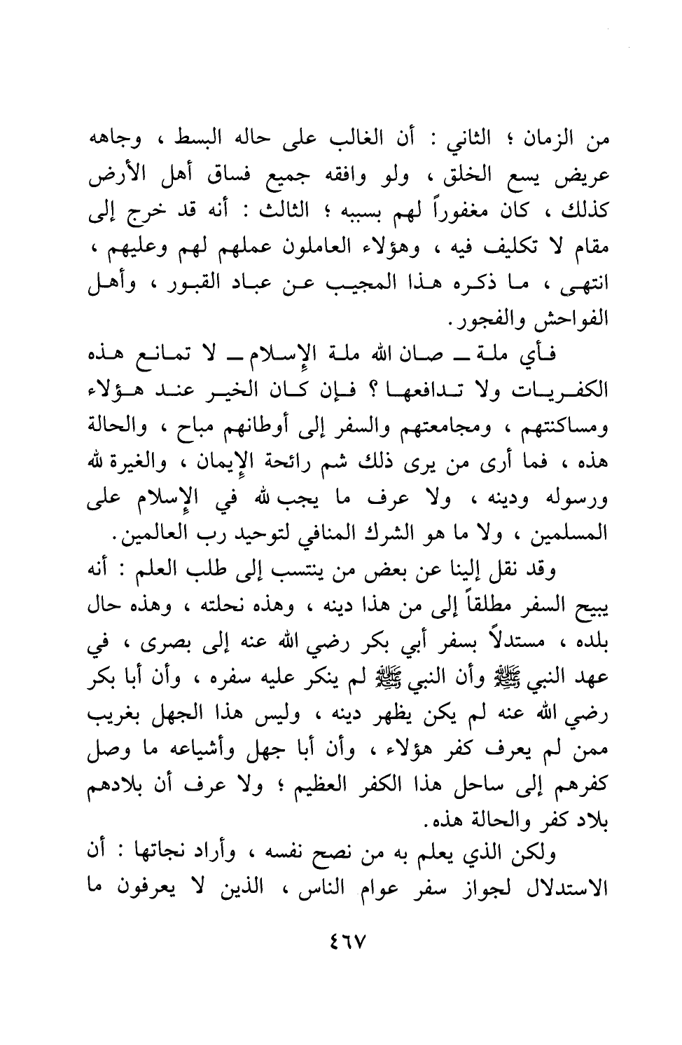 وقد نقل إلينا عن بعض من ينتسب إلى طلب العلم، أنه يبيح السفر مطلقاً إلى مَن هذا دينه، وهذه نحلته، وهذه حال بلده، مستدلاً بسفر أبي بكر رضي الله عنه إلى بصرى، في عهد النبي صلى الله عليه وسلم، وأن النبي صلى الله عليه وسلم لم ينكر عليه سفره، وأن أبا بكر رضي الله عنه لم يكن يظهر دينه؛ وليس هذا الجهل بغريب ممن لم يعرف كفر هؤلاء، وأن أبا جهل وأشياعه ما وصل كفرهم إلى ساحل هذا الكفر العظيم، ولا عرف أن بلادهم بلاد كفر والحالة هذه.