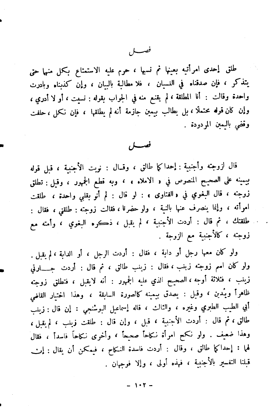 وَلَوْ كَانَ مَعَهَا رَجُلٌ أَوْ دَابَّةٌ، فَقَالَ: أَرَدْتُ الرَّجُلَ، أَوِ الدَّابَّةَ، لَمْ يُقْبَلْ. وَلَوْ كَانَ اسْمُ زَوْجَتِهِ زَيْنَبَ، فَقَالَ: زَيْنَبُ طَالِقٌ، ثُمَّ قَالَ: أَرَدْتُ جَارَتِي زَيْنَبَ، فَثَلَاثَةُ أَوْجُهٍ، الصَّحِيحُ الَّذِي عَلَيْهِ الْجُمْهُورُ: أَنَّهُ لَا يُقْبَلُ، فَتُطَلَّقُ زَوْجَتُهُ ظَاهِرًا وَيُدَيَّنُ، وَقِيلَ: يُصَدَّقُ بِيَمِينِهِ كَالصُّورَةِ السَّابِقَةِ، وَهَذَا اخْتِيَارُ الْقَاضِي أَبِي الطَّيِّبِ الطَّبَرِيِّ وَغَيْرِهِ، وَالثَّالِثُ، قَالَهُ إِسْمَاعِيلُ الْبُوشَنْجِيُّ: إِنْ قَالَ: زَيْنَبُ طَالِقٌ، ثُمَّ قَالَ: أَرَدْتُ الْأَجْنَبِيَّةَ، قُبِلَ، وَإِنْ قَالَ: طَلَّقْتُ زَيْنَبَ، لَمْ يُقْبَلْ، وَهَذَا ضَعِيفٌ. وَلَوْ نَكَحَ امْرَأَةً نِكَاحًا صَحِيحًا، وَأُخْرَى نِكَاحًا فَاسِدًا، فَقَالَ لَهُمَا: إِحْدَاكُمَا طَالِقٌ، وَقَالَ: أَرَدْتُ فَاسِدَةَ النِّكَاحِ، فَيُمْكِنُ أَنْ يُقَالَ: إِنْ قَبِلْنَا التَّفْسِيرَ بِالْأَجْنَبِيَّةِ، فَهَذِهِ أَوْلَى، وَإِلَّا فَوَجْهَانِ.