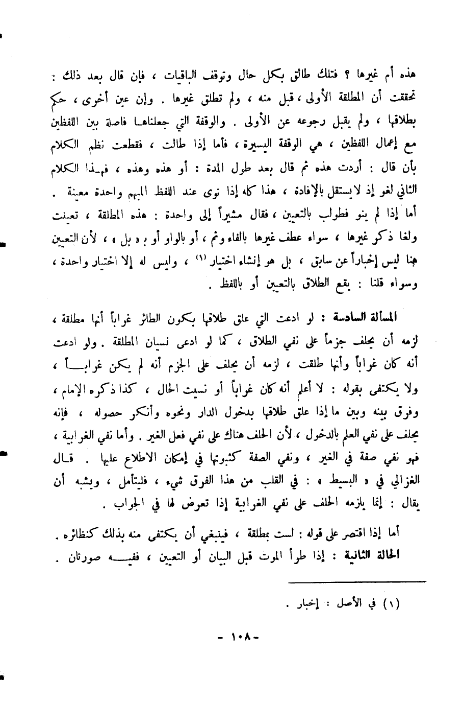 هَذِهِ أَمْ غَيْرُهَا؟ فَتِلْكَ طَالِقٌ بِكُلِّ حَالٍ وَتُوقَفُ الْبَاقِيَاتُ، فَإِنْ قَالَ بَعْدَ ذَلِكَ: تَحَقَّقْتُ أَنَّ الْمُطَلَّقَةَ الْأُولَى، قُبِلَ مِنْهُ، وَلَمْ تُطَلَّقْ غَيْرُهَا. وَإِنْ عَيَّنَ أُخْرَى، حُكِمَ بِطَلَاقِهَا، وَلَمْ يُقْبَلْ رُجُوعُهُ عَنِ الْأُولَى. وَالْوَقْفَةُ الَّتِي جَعَلْنَاهَا فَاصِلَةً بَيْنَ اللَّفْظَيْنِ مَعَ إِعْمَالِ اللَّفْظَيْنِ، هِيَ الْوَقْفَةُ الْيَسِيرَةُ، فَأَمَّا إِذَا طَالَتْ، فَقَطَعَتْ نَظْمَ الْكَلَامِ بِأَنْ قَالَ: أَرَدْتُ هَذِهِ ثُمَّ قَالَ بَعْدَ طُولِ الْمُدَّةِ: أَوْ هَذِهِ وَهَذِهِ، فَهَذَا الْكَلَامُ الثَّانِي لَغْوٌ إِذْ لَا يَسْتَقِلُّ بِالْإِفَادَةِ، هَذَا كُلُّهُ إِذَا نَوَى عِنْدَ اللَّفْظِ الْمُبْهَمِ وَاحِدَةً مُعَيَّنَةً. أَمَّا إِذَا لَمْ يَنْوِ فَطُولِبَ بِالتَّعْيِينِ، فَقَالَ مُشِيرًا إِلَى وَاحِدَةٍ: هَذِهِ الْمُطَلَّقَةُ، تَعَيَّنَتْ وَلَغَا ذِكْرُ غَيْرِهَا، سَوَاءٌ عَطَفَ غَيْرَهَا بِالْفَاءِ وَثُمَّ، أَوْ بِالْوَاوِ أَوْ بِ «بَلْ» ، لِأَنَّ التَّعْيِينَ هُنَا لَيْسَ إِخْبَارًا عَنْ سَابِقٍ، بَلْ هُوَ إِنْشَاءُ اخْتِيَارٍ، وَلَيْسَ لَهُ إِلَّا اخْتِيَارُ وَاحِدَةٍ، وَسَوَاءٌ قُلْنَا: يَقَعُ الطَّلَاقُ بِالتَّعْيِينِ أَوْ بِاللَّفْظِ.
