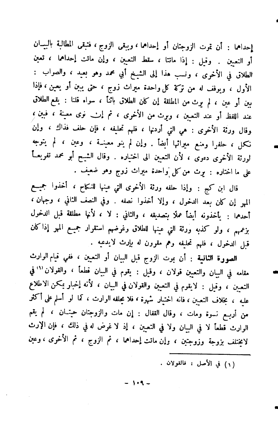 إِحْدَاهُمَا: أَنْ تَمُوتَ الزَّوْجَتَانِ أَوْ إِحْدَاهُمَا، وَيَبْقَى الزَّوْجُ، فَتَبْقَى الْمُطَالَبَةُ بِالْبَيَانِ أَوِ التَّعْيِينِ. وَقِيلَ: إِذَا مَاتَتَا، سَقَطَ التَّعْيِينُ، وَإِنْ مَاتَتْ إِحْدَاهُمَا، تَعَيَّنَ الطَّلَاقُ فِي الْأُخْرَى، وَنُسِبَ هَذَا إِلَى الشَّيْخِ أَبِي مُحَمَّدٍ وَهُوَ بَعِيدٌ، وَالصَّوَابُ: الْأَوَّلُ، وَيُوقَفُ لَهُ مِنْ تَرِكَةِ كُلِّ وَاحِدَةٍ مِيرَاثُ زَوْجٍ، حَتَّى يُبَيِّنَ أَوْ يُعَيِّنَ، فَإِذَا بَيَّنَ أَوْ عَيَّنَ، لَمْ يَرِثْ مِنَ الْمُطَلَّقَةِ إِنْ كَانَ الطَّلَاقُ بَائِنًا، سَوَاءٌ قُلْنَا: يَقَعُ الطَّلَاقُ عِنْدَ اللَّفْظِ أَوْ عِنْدَ التَّعْيِينِ، وَيَرِثُ مِنَ الْأُخْرَى، ثُمَّ إِنْ نَوَى مُعَيَّنَةً، فَبَيَّنَ، وَقَالَ وَرَثَةُ الْأُخْرَى: هِيَ الَّتِي أَرَدْتَهَا، فَلَهُمْ تَحْلِيفُهُ، فَإِنْ حَلَفَ فَذَاكَ، وَإِنْ نَكَلَ، حَلَفُوا وَمُنِعَ مِيرَاثَهَا أَيْضًا. وَإِنْ لَمْ يَنْوِ مُعَيَّنَةً، وَعَيَّنَ، لَمْ يَتَوَجَّهْ لِوَرَثَةِ الْأُخْرَى دَعْوَى، لِأَنَّ التَّعْيِينَ إِلَى اخْتِيَارِهِ. وَقَالَ الشَّيْخُ أَبُو مُحَمَّدٍ تَفْرِيعًا عَلَى مَا اخْتَارَهُ: يَرِثُ مِنْ كُلِّ وَاحِدَةٍ مِيرَاثَ زَوْجٍ وَهُوَ ضَعِيفٌ.