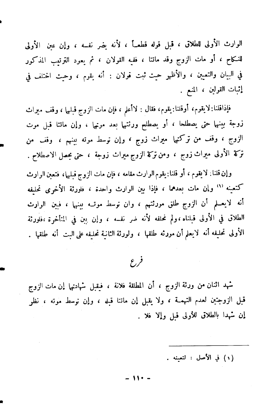 شَهِدَ اثْنَانِ مِنْ وَرَثَةِ الزَّوْجِ، أَنَّ الْمُطَلَّقَةَ فُلَانَةٌ، فَيُقْبَلُ شَهَادَتُهُمَا إِنْ مَاتَ الزَّوْجُ قَبْلَ الزَّوْجَتَيْنِ لِعَدَمِ التُّهْمَةِ، وَلَا يُقْبَلُ إِنْ مَاتَتَا قَبْلَهُ، وَإِنْ تَوَسَّطَ مَوْتُهُ، نُظِرَ إِنْ شَهِدَا بِالطَّلَاقِ لِلْأُولَى قُبِلَ وَإِلَّا فَلَا.
