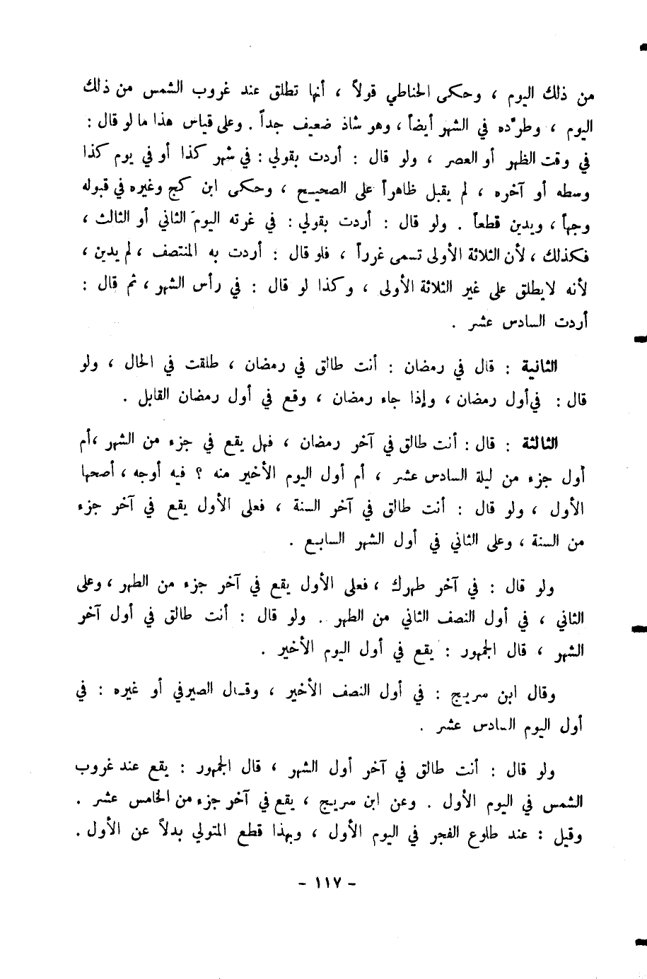مِنْ ذَلِكَ الْيَوْمِ، وَحَكَى الْحَنَّاطِيُّ قَوْلًا، أَنَّهَا تُطَلَّقُ عِنْدَ غُرُوبِ الشَّمْسِ مِنْ ذَلِكَ الْيَوْمِ، وَطَرَدَهُ فِي الشَّهْرِ أَيْضًا، وَهُوَ شَاذٌّ ضَعِيفٌ جِدًّا. وَعَلَى قِيَاسِ هَذَا مَا لَوْ قَالَ: فِي وَقْتِ الظُّهْرِ أَوِ الْعَصْرِ، وَلَوْ قَالَ: أَرَدْتُ بِقَوْلِي: فِي شَهْرِ كَذَا أَوْ فِي يَوْمِ كَذَا وَسَطَهُ أَوْ آخِرَهُ، لَمْ يُقْبَلْ ظَاهِرًا عَلَى الصَّحِيحِ، وَحَكَى ابْنُ كَجٍّ وَغَيْرُهُ فِي قَبُولِهِ وَجْهًا، وَيُدَيَّنُ قَطْعًا. وَلَوْ قَالَ: أَرَدْتُ بِقَوْلِي: فِي غُرَّتِهِ الْيَوْمَ الثَّانِيَ أَوِ الثَّالِثَ، فَكَذَلِكَ، لِأَنَّ الثَّلَاثَةَ الْأُولَى تُسَمَّى غُرَرًا، فَلَوْ قَالَ: أَرَدْتُ بِهِ الْمُنْتَصَفَ، لَمْ يُدَيَّنْ، لِأَنَّهُ لَا يُطْلَقُ عَلَى غَيْرِ الثَّلَاثَةِ الْأُولَى، وَكَذَا لَوْ قَالَ: فِي رَأْسِ الشَّهْرِ، ثُمَّ قَالَ: أَرَدْتُ السَّادِسَ عَشَرَ.
