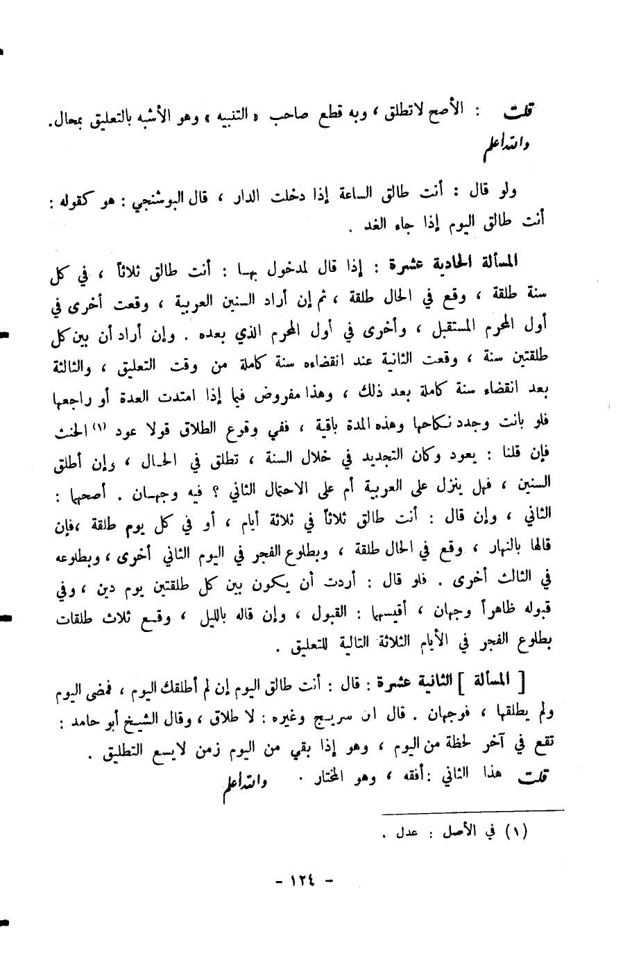 الْمَسْأَلَةُ الْحَادِيَةَ عَشْرَةَ: إِذَا قَالَ لِمَدْخُولٍ بِهَا: أَنْتِ طَالِقٌ ثَلَاثًا، فِي كُلِّ سَنَةٍ طَلْقَةٌ، وَقَعَ فِي الْحَالِ طَلْقَةٌ، ثُمَّ إِنْ أَرَادَ السِّنِينَ الْعَرَبِيَّةَ، وَقَعَتْ أُخْرَى فِي أَوَّلِ الْمُحَرَّمِ الْمُسْتَقْبَلِ، وَأُخْرَى فِي أَوَّلِ الْمُحَرَّمِ الَّذِي بَعْدَهُ. وَإِنْ أَرَادَ أَنَّ بَيْنَ كُلِّ طَلْقَتَيْنِ سَنَةً، وَقَعَتِ الثَّانِيَةُ عِنْدَ انْقِضَاءِهِ سَنَةً كَامِلَةً مِنْ وَقْتِ التَّعْلِيقِ، وَالثَّالِثَةُ بَعْدَ انْقِضَاءِ سَنَةٍ كَامِلَةٍ بَعْدَ ذَلِكَ، وَهَذَا مَفْرُوضٌ فِيمَا إِذَا امْتَدَّتِ الْعِدَّةُ أَوْ رَاجَعَهَا، فَلَوْ بَانَتْ وَجَدَّدَ نِكَاحَهَا وَهَذِهِ الْمُدَّةُ بَاقِيَةٌ، فَفِي وُقُوعِ الطَّلَاقِ قَوْلَا عَوْدِ الْحِنْثِ فَإِنْ قُلْنَا: يَعُودُ وَكَانَ التَّجْدِيدُ فِي خِلَالِ السَّنَةِ، تُطَلَّقُ فِي الْحَالِ، وَإِنْ أَطْلَقَ السِّنِينَ، فَهَلْ يَنْزِلُ عَلَى الْعَرَبِيَّةِ أَمْ عَلَى الِاحْتِمَالِ الثَّانِي؟ فِيهِ وَجْهَانِ. أَصَحُّهُمَا: الثَّانِي، وَإِنْ قَالَ: أَنْتِ طَالِقٌ ثَلَاثًا فِي ثَلَاثَةِ أَيَّامٍ، أَوْ فِي كُلِّ يَوْمٍ طَلْقَةٌ، فَإِنْ قَالَهَا بِالنَّهَارِ، وَقَعَ فِي الْحَالِ طَلْقَةٌ، وَبِطُلُوعِ الْفَجْرِ فِي الْيَوْمِ الثَّانِي أُخْرَى، وَبِطُلُوعِهِ فِي الثَّالِثِ أُخْرَى. فَلَوْ قَالَ: أَرَدْتُ أَنْ يَكُونَ بَيْنَ كُلِّ طَلْقَتَيْنِ يَوْمٌ دُيِّنَ، وَفِي قَبُولِهِ ظَاهِرًا وَجْهَانِ، أَقْيَسُهُمَا: الْقَبُولُ، وَإِنْ قَالَهُ بِاللَّيْلِ، وَقَعَ ثَلَاثُ طَلَقَاتٍ بِطُلُوعِ الْفَجْرِ فِي الْأَيَّامِ الثَّلَاثَةِ التَّالِيَةِ لِلتَّعْلِيقِ.