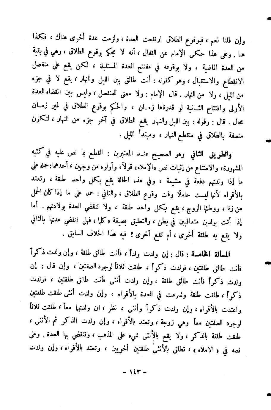 الْمَسْأَلَةُ الْخَامِسَةُ: قَالَ: إِنْ وَلَدْتِ وَلَدًا، فَأَنْتِ طَالِقٌ طَلْقَةً، وَإِنْ وَلَدْتِ ذَكَرًا فَأَنْتِ طَالِقٌ طَلْقَتَيْنِ، فَوَلَدَتْ ذَكَرًا، طُلِّقَتْ ثَلَاثًا لِوُجُودِ الصِّفَتَيْنِ، وَإِنْ قَالَ: إِنْ وَلَدْتِ ذَكَرًا فَأَنْتِ طَالِقٌ طَلْقَةً، وَإِنْ وَلَدْتِ أُنْثَى فَأَنْتِ طَالِقٌ طَلْقَتَيْنِ، فَوَلَدَتْ ذَكَرًا، طُلِّقَتْ طَلْقَةً وَشَرَعَتْ فِي الْعِدَّةِ بِالْأَقْرَاءِ، وَإِنْ وَلَدَتْ أُنْثَى طُلِّقَتْ طَلْقَتَيْنِ وَاعْتَدَّتْ بِالْأَقْرَاءِ، وَإِنْ وَلَدَتْ ذَكَرًا وَأُنْثَى، نُظِرَ، إِنْ وَلَدَتْهُمَا مَعًا، طُلِّقَتْ ثَلَاثًا لِوُجُودِ الصِّفَتَيْنِ مَعًا وَهِيَ زَوْجَةٌ، وَتَعْتَدُّ بِالْأَقْرَاءِ، وَإِنْ وَلَدَتِ الذَّكَرَ ثُمَّ الْأُنْثَى، طُلِّقَتْ طَلْقَةً بِالذَّكَرِ، وَلَا يَقَعُ بِالْأُنْثَى شَيْءٌ عَلَى الْمَذْهَبِ، وَتَنْقَضِي بِهَا الْعِدَّةُ. وَعَلَى نَصِّهِ فِي «الْإِمْلَاءِ» ، تُطَلَّقُ بِالْأُنْثَى طَلْقَتَيْنِ أُخْرَيَيْنِ، وَتَعْتَدُّ بِالْأَقْرَاءِ، وَإِنْ وَلَدَتِ