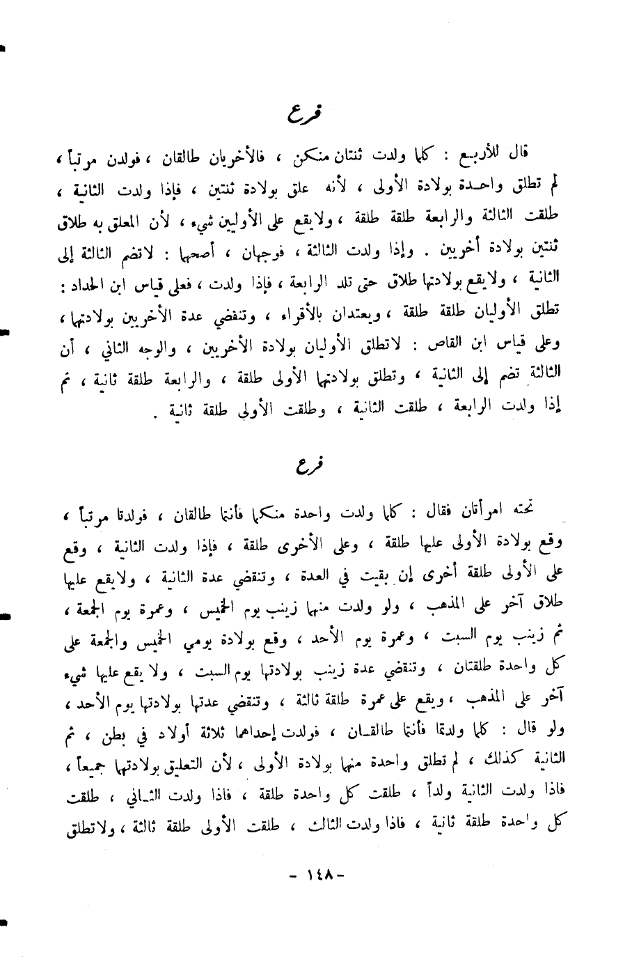 قَالَ لِلْأَرْبَعِ: كُلَّمَا وَلَدَتْ ثِنْتَانِ مِنْكُنَّ، فَالْأُخْرَيَانِ طَالِقَانِ، فَوَلَدْنَ مُرَتَّبًا، لَمْ تُطَلَّقْ وَاحِدَةٌ بِوِلَادَةِ الْأُولَى، لِأَنَّهُ عَلَّقَ بِوِلَادَةِ ثِنْتَيْنِ، فَإِذَا وَلَدَتِ الثَّانِيَةُ، طُلِّقَتِ الثَّالِثَةُ وَالرَّابِعَةُ طَلْقَةً طَلْقَةً، وَلَا يَقَعُ عَلَى الْأُولَيَيْنِ شَيْءٌ، لِأَنَّ الْمُعَلَّقَ بِهِ طَلَاقُ ثِنْتَيْنِ بِوِلَادَةِ أُخْرَيَيْنِ. وَإِذَا وَلَدَتِ الثَّالِثَةُ، فَوَجْهَانِ، أَصَحُّهُمَا: لَا تُضَمُّ الثَّالِثَةُ إِلَى الثَّانِيَةِ، وَلَا يَقَعُ بِوِلَادَتِهَا طَلَاقٌ حَتَّى تَلِدَ الرَّابِعَةُ، فَإِذَا وَلَدَتْ، فَعَلَى قِيَاسِ ابْنِ الْحَدَّادِ: تُطَلَّقُ الْأُولَيَانِ طَلْقَةً طَلْقَةً، وَيَعْتَدَّانِ بِالْأَقْرَاءِ، وَتَنْقَضِي عِدَّةُ الْأُخْرَيَيْنِ بِوِلَادَتِهِمَا، وَعَلَى قِيَاسِ ابْنِ الْقَاصِّ: لَا تُطَلَّقُ الْأُولَيَانِ بِوِلَادَةِ الْأُخْرَيَيْنِ، وَالْوَجْهُ الثَّانِي، أَنَّ الثَّالِثَةَ تُضَمُّ إِلَى الثَّانِيَةِ، وَتُطَلَّقُ بِوِلَادَتِهِمَا الْأُولَى طَلْقَةً، وَالرَّابِعَةُ طَلْقَةً ثَانِيَةً، ثُمَّ إِذَا وَلَدَتِ الرَّابِعَةُ، طُلِّقَتِ الثَّانِيَةُ، وَطُلِّقَتِ الْأُولَى طَلْقَةً ثَانِيَةً.