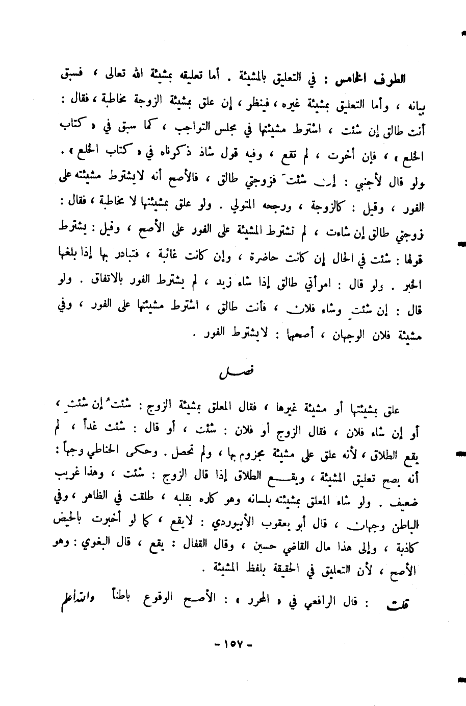الطَّرَفُ الْخَامِسُ: فِي التَّعْلِيقِ بِالْمَشِيئَةِ. أَمَّا تَعْلِيقُهُ بِمَشِيئَةِ اللَّهِ تَعَالَى، فَسَبَقَ بَيَانُهُ، وَأَمَّا التَّعْلِيقُ بِمَشِيئَةِ غَيْرِهِ، فَيُنْظَرُ، إِنْ عَلَّقَ بِمَشِيئَةِ الزَّوْجَةِ مُخَاطَبَةً، فَقَالَ: أَنْتِ طَالِقٌ إِنْ شِئْتِ، اشْتُرِطَ مَشِيئَتُهَا فِي مَجْلِسِ التَّوَاجُبِ، كَمَا سَبَقَ فِي «كِتَابِ الْخُلْعِ» ، فَإِنْ أَخَّرَتْ، لَمْ تَقَعْ، وَفِيهِ قَوْلٌ شَاذٌّ ذَكَرْنَاهُ فِي «كِتَابِ الْخُلْعِ» . وَلَوْ قَالَ لِأَجْنَبِيٍّ: إِنْ شِئْتَ فَزَوْجَتِي طَالِقٌ، فَالْأَصَحُّ أَنَّهُ لَا يُشْتَرَطُ مَشِيئَتُهُ عَلَى الْفَوْرِ، وَقِيلَ: كَالزَّوْجَةِ، وَرَجَّحَهُ الْمُتَوَلِّي. وَلَوْ عَلَّقَ بِمَشِيئَتِهَا لَا مُخَاطَبَةً، فَقَالَ: زَوْجَتِي طَالِقٌ إِنْ شَاءَتْ، لَمْ تُشْتَرَطِ الْمَشِيئَةُ عَلَى الْفَوْرِ عَلَى الْأَصَحِّ، وَقِيلَ: يُشْتَرَطُ قَوْلُهَا: شِئْتُ فِي الْحَالِ إِنْ كَانَتْ حَاضِرَةً، وَإِنْ كَانَتْ غَائِبَةً، فَتُبَادِرُ بِهَا إِذَا بَلَغَهَا الْخَبَرُ. وَلَوْ قَالَ: امْرَأَتِي طَالِقٌ إِذَا شَاءَ زَيْدٌ، لَمْ يُشْتَرَطُ الْفَوْرُ بِالِاتِّفَاقِ. وَلَوْ قَالَ: إِنْ شِئْتِ وَشَاءَ فُلَانٌ، فَأَنْتِ طَالِقٌ، اشْتُرِطَ مَشِيئَتُهَا عَلَى الْفَوْرِ، وَفِي مَشِيئَةِ فُلَانٍ الْوَجْهَانِ، أَصَحُّهُمَا: لَا يُشْتَرَطُ الْفَوْرُ.