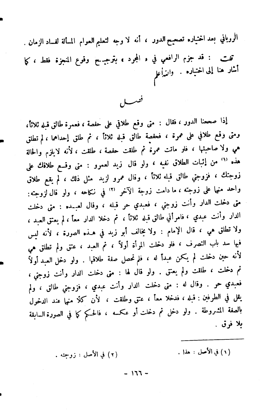 إِذَا صَحَّحْنَا الدَّوْرَ، فَقَالَ: مَتَى وَقَعَ طَلَاقِي عَلَى حَفْصَةَ، فَعَمْرَةُ طَالِقٌ قَبْلَهُ ثَلَاثًا، وَمَتَى وَقَعَ طَلَاقِي عَلَى عَمْرَةَ، فَحَفْصَةُ طَالِقٌ قَبْلَهُ ثَلَاثًا، ثُمَّ طَلَّقَ إِحْدَاهُمَا، لَمْ تُطَلَّقْ هِيَ وَلَا صَاحِبَتُهَا، فَلَوْ مَاتَتْ عَمْرَةُ ثُمَّ طُلِّقَتْ حَفْصَةُ، طُلِّقَتْ، لِأَنَّهُ لَا يَلْزَمُ وَالْحَالَةُ هَذِهِ مِنْ إِثْبَاتِ الطَّلَاقِ نَفْيُهُ، وَلَوْ قَالَ زَيْدٌ لِعَمْرٍو: مَتَى وَقَعَ طَلَاقُكَ عَلَى زَوْجَتِكَ، فَزَوْجَتِي طَالِقٌ قَبْلَهُ ثَلَاثًا، وَقَالَ عَمْرٌو لِزَيْدٍ مِثْلَ ذَلِكَ، لَمْ يَقَعْ طَلَاقٌ وَاحِدٌ مِنْهُمَا عَلَى زَوْجَتِهِ، مَا دَامَتْ زَوْجَةُ الْآخَرِ فِي نِكَاحِهِ، وَلَوْ قَالَ لِزَوْجَتِهِ: مَتَى دَخَلْتِ الدَّارَ وَأَنْتِ زَوْجَتِي، فَعَبْدِي حُرٌّ قَبْلَهُ، وَقَالَ لِعَبْدِهِ: مَتَى دَخَلْتَ الدَّارَ وَأَنْتَ عَبْدِي، فَامْرَأَتِي طَالِقٌ قَبْلَهُ ثَلَاثًا، ثُمَّ دَخَلَا الدَّارَ مَعًا، لَمْ يُعْتَقِ الْعَبْدُ، وَلَا تُطَلَّقُ هِيَ، قَالَ الْإِمَامُ: وَلَا يُخَالِفُ أَبُو زَيْدٍ فِي هَذِهِ الصُّورَةِ، لِأَنَّهُ لَيْسَ فِيهَا سَدُّ بَابِ التَّصَرُّفِ، فَلَوْ دَخَلَتِ الْمَرْأَةُ أَوَّلًا، ثُمَّ الْعَبْدُ، عَتَقَ وَلَمْ تُطَلَّقْ هِيَ لِأَنَّهُ حِينَ دَخَلَتْ لَمْ يَكُنْ عَبْدًا لَهُ، فَلَمْ تَحْصُلْ صِفَةُ طَلَاقِهَا.