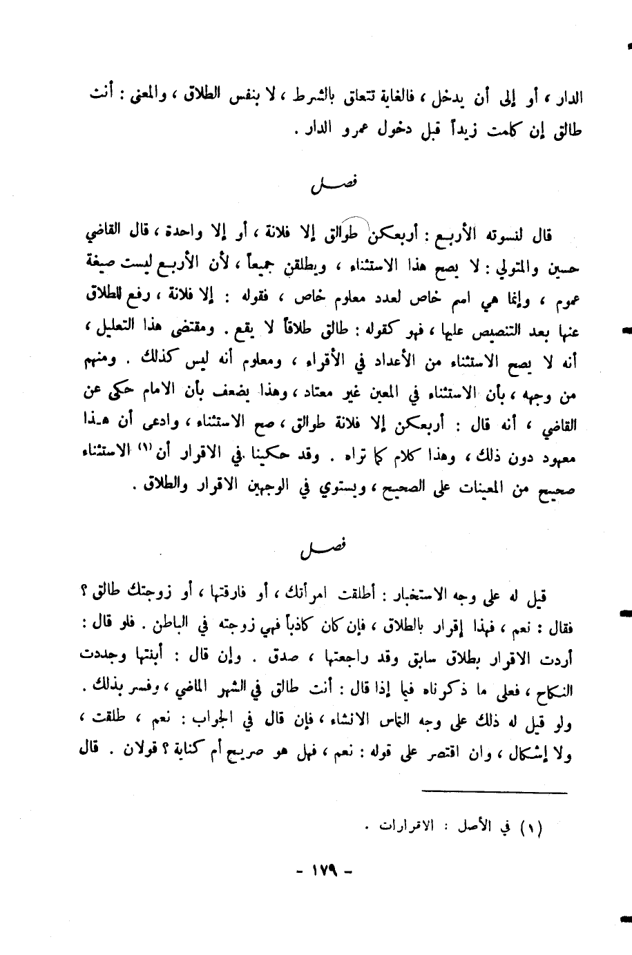 قَالَ لِنِسْوَتِهِ الْأَرْبَعِ: أَرَبْعُكُنَّ طَوَالِقُ إِلَّا فُلَانَةً، أَوْ إِلَّا وَاحِدَةً، قَالَ الْقَاضِي حُسَيْنٌ وَالْمُتَوَلِّي: لَا يَصِحُّ هَذَا الِاسْتِثْنَاءُ، وَيُطَلَّقْنَ جَمِيعًا، لِأَنَّ الْأَرْبَعَ لَيْسَتْ صِيغَةَ عُمُومٍ، وَإِنَّمَا هِيَ اسْمٌ خَاصٌّ لِعَدَدٍ مَعْلُومٍ خَاصٍّ، فَقَوْلُهُ: إِلَّا فُلَانَةً، رَفْعٌ لِلطَّلَاقِ عَنْهَا بَعْدَ التَّنْصِيصِ عَلَيْهَا، فَهُوَ كَقَوْلِهِ: طَالِقٌ طَلَاقًا لَا يَقَعُ. وَمُقْتَضَى هَذَا التَّعْلِيلِ، أَنَّهُ لَا يَصِحُّ الِاسْتِثْنَاءُ مِنَ الْأَعْدَادِ فِي الْأَقْرَاءِ، وَمَعْلُومٌ أَنَّهُ لَيْسَ كَذَلِكَ. وَمِنْهُمْ مَنْ وَجَّهَهُ، بِأَنَّ الِاسْتِثْنَاءَ فِي الْمُعَيَّنِ غَيْرُ مُعْتَادٍ، وَهَذَا يَضْعُفُ بِأَنَّ الْإِمَامَ حَكَى عَنِ الْقَاضِي، أَنَّهُ قَالَ: أَرَبْعُكُنَّ إِلَّا فُلَانَةً طَوَالِقُ، صَحَّ الِاسْتِثْنَاءُ، وَادَّعَى أَنَّ هَذَا مَعْهُودٌ دُونَ ذَلِكَ، وَهَذَا كَلَامٌ كَمَا تَرَاهُ. وَقَدْ حَكَيْنَا فِي الْإِقْرَارِ أَنَّ الِاسْتِثْنَاءَ صَحِيحٌ مِنَ الْمُعَيَّنَاتِ عَلَى الصَّحِيحِ، وَيَسْتَوِي فِي الْوَجْهَيْنِ الْإِقْرَارُ وَالطَّلَاقُ.