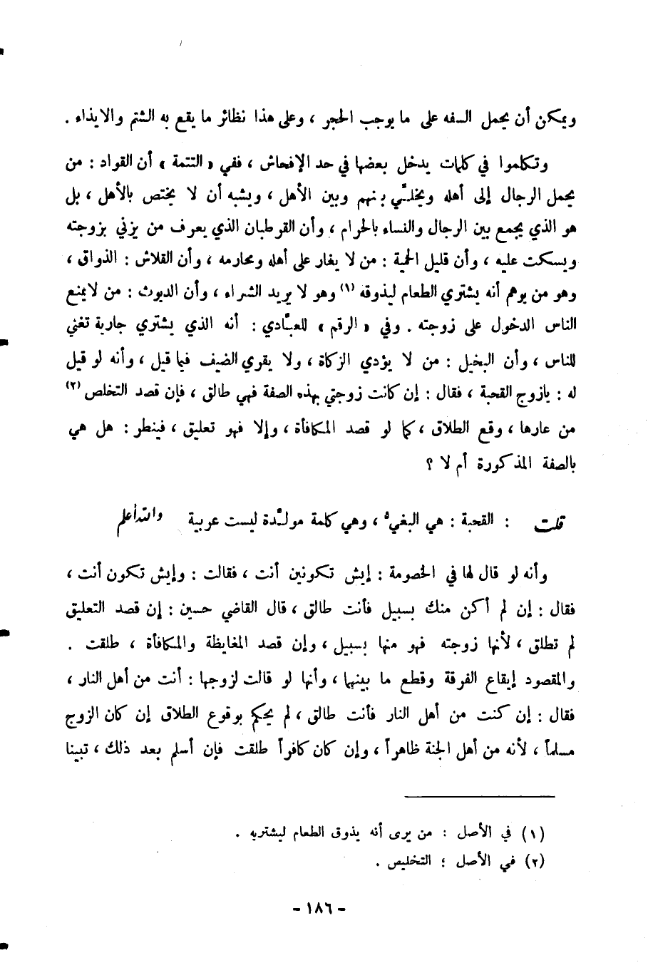 وَفِي «الرَّقْمِ» لِلْعَبَّادِيِّ: أَنَّهُ الَّذِي يَشْتَرِي جَارِيَةً تُغَنِّي لِلنَّاسِ، وَأَنَّ الْبَخِيلَ: مَنْ لَا يُؤَدِّي الزَّكَاةَ، وَلَا يَقْرِي الضَّيْفَ فِيمَا قِيلَ، وَأَنَّهُ لَوْ قِيلَ لَهُ: يَا زَوْجَ الْقَحْبَةِ، فَقَالَ: إِنْ كَانَتْ زَوْجَتِي بِهَذِهِ الصِّفَةِ فَهِيَ طَالِقٌ، فَإِنْ قَصَدَ التَّخَلُّصَ مِنْ عَارِهَا، وَقَعَ الطَّلَاقُ، كَمَا لَوْ قَصَدَ الْمُكَافَأَةَ، وَإِلَّا فَهُوَ تَعْلِيقٌ، فَيُنْظَرُ: هَلْ هِيَ بِالصِّفَةِ الْمَذْكُورَةِ أَمْ لَا؟ قُلْتُ: الْقَحْبَةُ: هِيَ الْبَغِيُّ، وَهِيَ كَلِمَةٌ مُوَلَّدَةٌ لَيْسَتْ عَرَبِيَّةً. - وَاللَّهُ أَعْلَمُ.