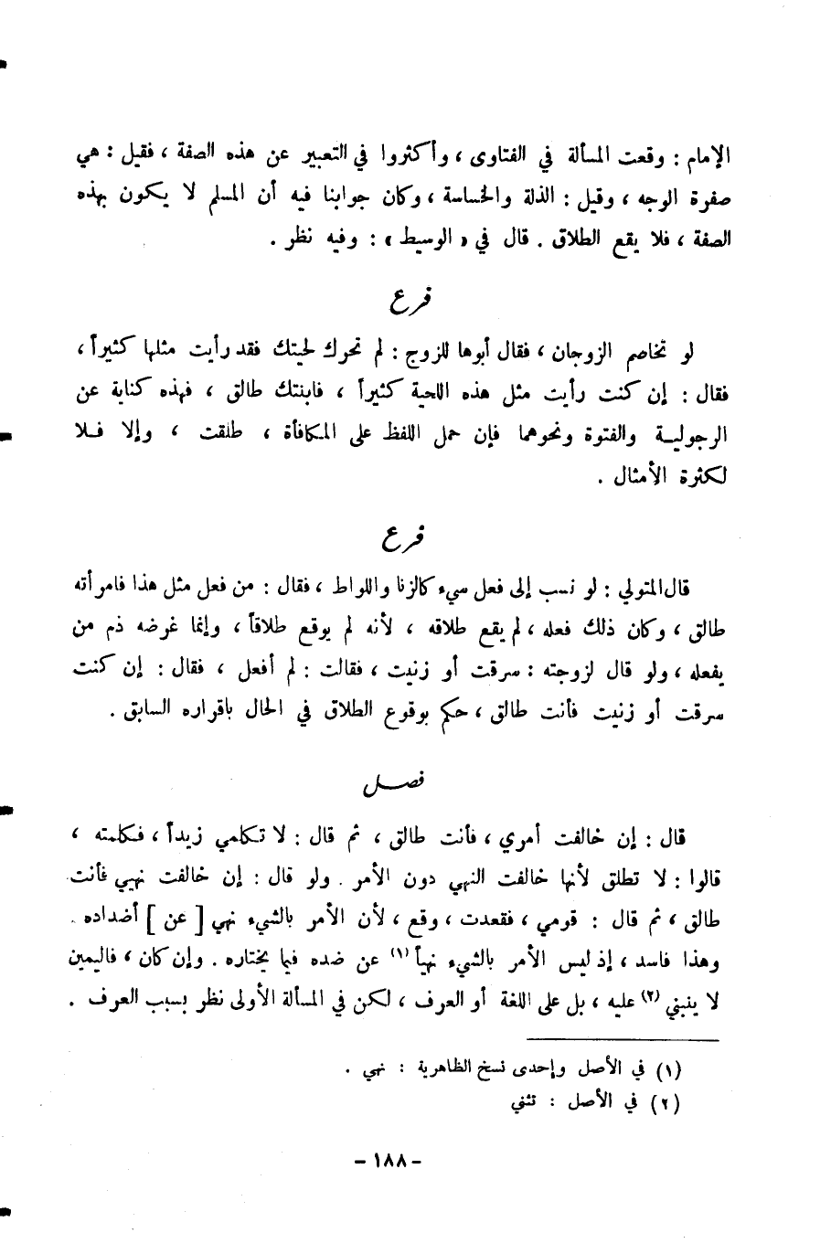 قَالَ: إِنْ خَالَفْتِ أَمْرِي، فَأَنْتِ طَالِقٌ، ثُمَّ قَالَ: لَا تُكَلِّمِي زَيْدًا، فَكَلَّمَتْهُ، قَالُوا: لَا تُطَلَّقُ لِأَنَّهَا خَالَفَتِ النَّهْيَ دُونَ الْأَمْرِ، وَلَوْ قَالَ: إِنْ خَالَفْتِ نَهْيِي فَأَنْتِ طَالِقٌ، ثُمَّ قَالَ: قُومِي، فَقَعَدَتْ، وَقَعَ لِأَنَّ الْأَمْرَ بِالشَّيْءِ نَهْيٌ