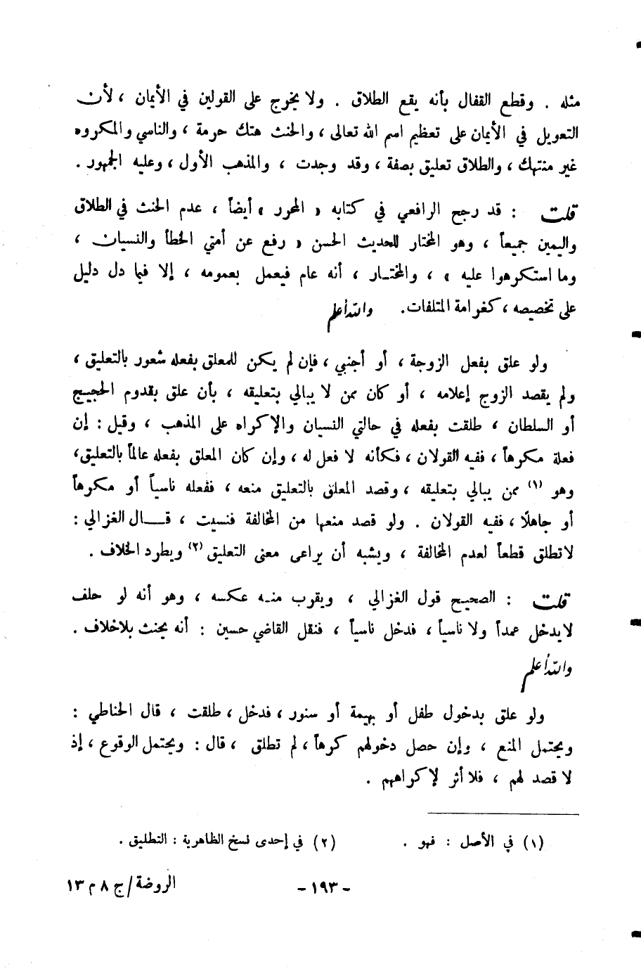 قُلْتُ: قَدْ رَجَّحَ الرَّافِعِيُّ فِي كِتَابِهِ الْمُحَرَّرِ أَيْضًا عَدَمَ الْحِنْثِ فِي الطَّلَاقِ وَالْيَمِينِ جَمِيعًا، وَهُوَ الْمُخْتَارُ لِلْحَدِيثِ الْحَسَنِ: رُفِعَ عَنْ أُمَّتِي الْخَطَأُ وَالنِّسْيَانُ، وَمَا اسْتُكْرِهُوا عَلَيْهِ. وَالْمُخْتَارُ أَنَّهُ عَامٌّ فَيُعْمَلُ بِعُمُومِهِ، إِلَّا فِيمَا دَلَّ دَلِيلٌ عَلَى تَخْصِيصِهِ، كَغَرَامَةِ الْمُتْلَفَاتِ. - وَاللَّهُ أَعْلَمُ.