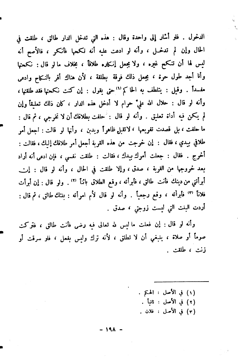 وَقِيلَ: يَتَلَطَّفُ بِهِ الْحَاكِمُ حَتَّى يَقُولَ: إِنْ كُنْتُ نَكَحْتُهَا فَقَدْ طَلَّقْتُهَا، وَأَنَّهُ لَوْ قَالَ: حَلَالُ اللَّهِ عَلَيَّ حَرَامٌ لَا أَدْخُلُ هَذِهِ الدَّارَ، كَانَ ذَلِكَ تَعْلِيقًا وَإِنْ لَمْ يَكُنْ فِيهِ أَدَاةُ تَعْلِيقٍ.