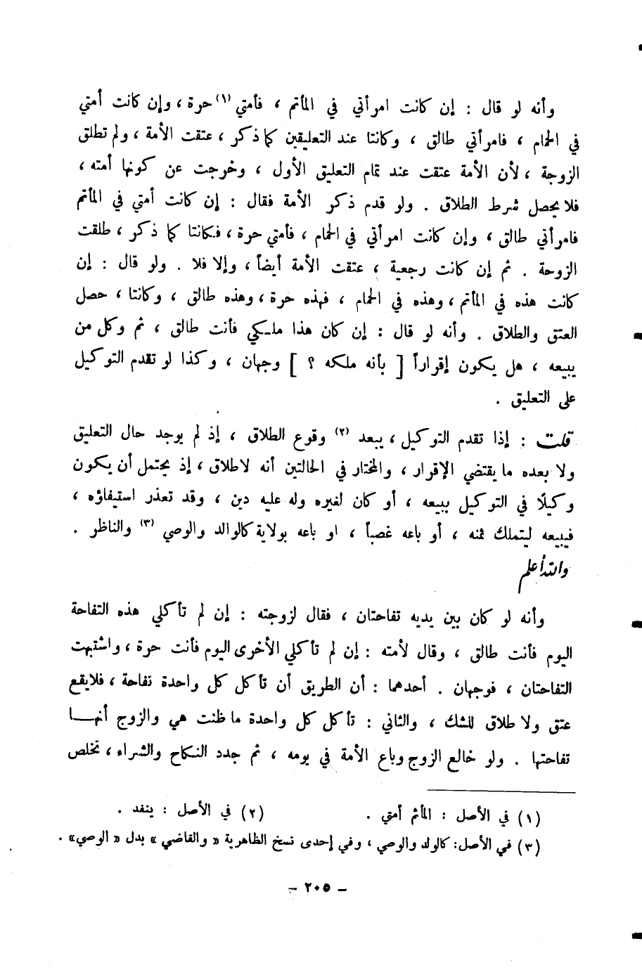 وَأَنَّهُ لَوْ قَالَ: إِنْ كَانَتِ امْرَأَتِي فِي الْمَأْتَمِ، فَأَمَتِي حُرَّةٌ، وَإِنْ كَانَتْ أَمَتِي فِي الْحَمَّامِ، فَامْرَأَتِي طَالِقٌ، وَكَانَتَا عِنْدَ التَّعْلِيقَيْنِ كَمَا ذَكَرَ، عَتَقَتِ الْأَمَةُ، وَلَمْ تُطَلَّقِ الزَّوْجَةُ، لِأَنَّ الْأَمَةَ عَتَقَتْ عِنْدَ تَمَامِ التَّعْلِيقِ الْأَوَّلِ، وَخَرَجَتْ عَنْ كَوْنِهَا أَمَتَهُ، فَلَا يَحْصُلُ شَرْطُ الطَّلَاقِ. وَلَوْ قَدَّمَ ذِكْرَ الْأَمَةِ فَقَالَ: إِنْ كَانَتْ أَمَتِي فِي الْمَأْتَمِ فَامْرَأَتِي طَالِقٌ، وَإِنْ كَانَتِ امْرَأَتِي فِي الْحَمَّامِ، فَأَمَتِي حُرَّةٌ، فَكَانَتَا كَمَا ذَكَرَ، طُلِّقَتِ الزَّوْجَةُ.