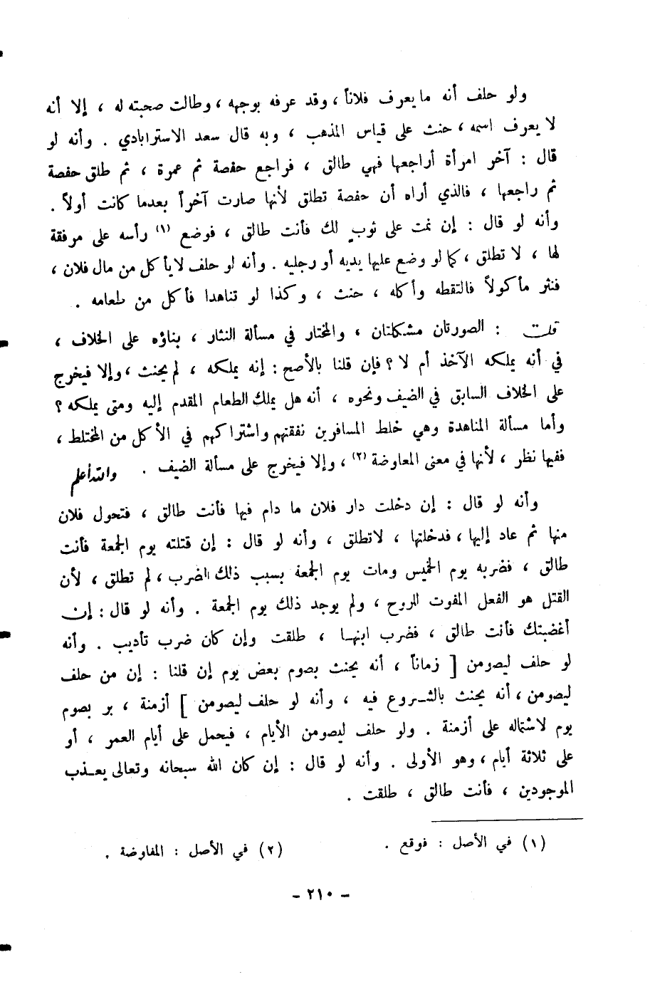 وَلَوْ حَلَفَ أَنَّهُ مَا يَعْرِفُ فُلَانًا، وَقَدْ عَرَفَهُ بِوَجْهِهِ، وَطَالَتْ صُحْبَتُهُ لَهُ، إِلَّا أَنَّهُ لَا يَعْرِفُ اسْمَهُ، حَنِثَ عَلَى قِيَاسِ الْمَذْهَبِ، وَبِهِ قَالَ سَعْدٌ الِاسْتِرَابَادِيُّ. وَأَنَّهُ لَوْ قَالَ: آخِرُ امْرَأَةٍ أُرَاجِعُهَا فَهِيَ طَالِقٌ، فَرَاجَعَ حَفْصَةَ ثُمَّ عَمْرَةَ، ثُمَّ طَلَّقَ حَفْصَةَ ثُمَّ رَاجَعَهَا، فَالَّذِي أَرَاهُ أَنَّ حَفْصَةَ تُطَلَّقُ لِأَنَّهَا صَارَتْ آخِرًا بَعْدَمَا كَانَتْ أَوَّلًا. وَأَنَّهُ لَوْ قَالَ: إِنْ نِمْتُ عَلَى ثَوْبٍ لَكِ فَأَنْتِ طَالِقٌ، فَوَضَعَ رَأْسَهُ عَلَى مِرْفَقَةٍ لَهَا، لَا تُطَلَّقُ، كَمَا لَوْ وَضَعَ عَلَيْهَا يَدَيْهِ أَوْ رِجْلَيْهِ.