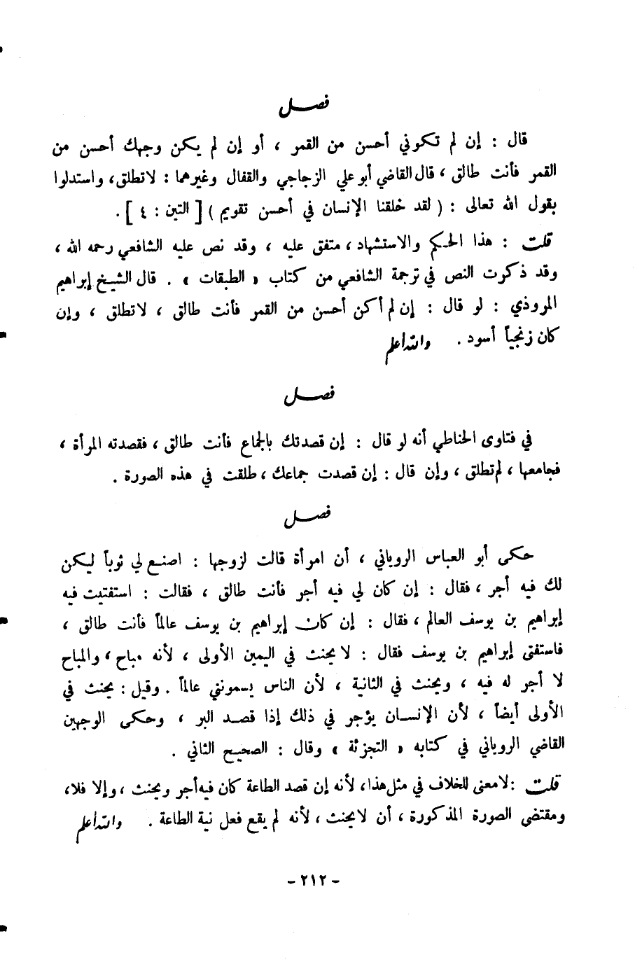 قَالَ: إِنْ لَمْ تَكُونِي أَحْسَنَ مِنَ الْقَمَرِ، أَوْ إِنْ لَمْ يَكُنْ وَجْهُكِ أَحْسَنَ مِنَ الْقَمَرِ فَأَنْتِ طَالِقٌ، قَالَ الْقَاضِي أَبُو عَلِيٍّ الزَّجَّاجِيُّ وَالْقَفَّالُ وَغَيْرُهُمَا: لَا تُطَلَّقُ، وَاسْتَدَلُّوا بِقَوْلِ اللَّهِ تَعَالَى: لَقَدْ خَلَقْنَا الْإِنْسَانَ فِي أَحْسَنِ تَقْوِيمٍ