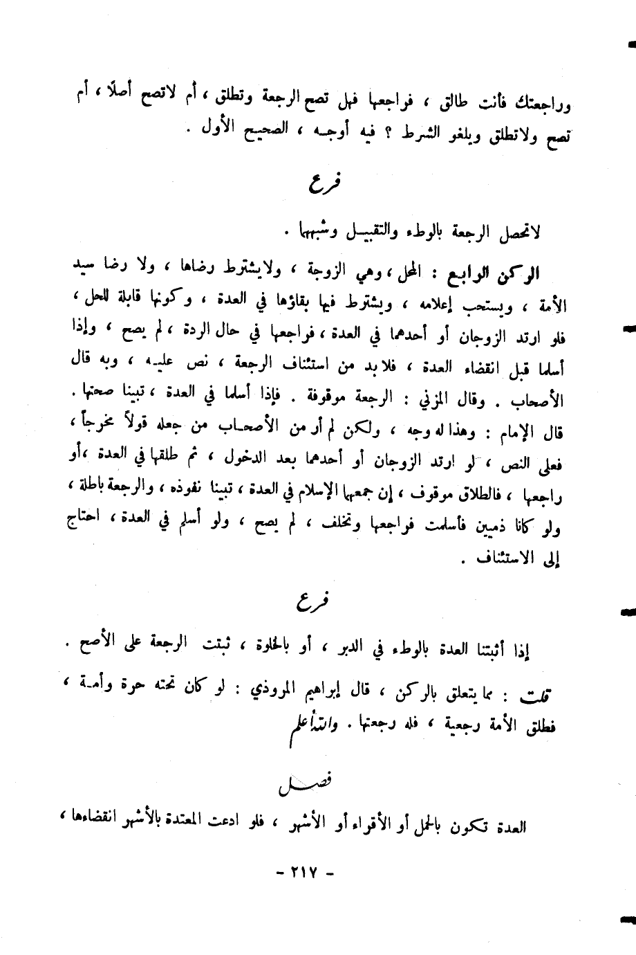 قُلْتُ: مِمَّا يَتَعَلَّقُ بِالرُّكْنِ، قَالَ إِبْرَاهِيمُ الْمَرُّوذِيُّ: لَوْ كَانَ تَحْتَهُ حُرَّةٌ وَأَمَةٌ، فَطَلَّقَ الْأَمَةَ رَجْعِيَّةً، فَلَهُ رَجْعَتُهَا. - وَاللَّهُ أَعْلَمُ.