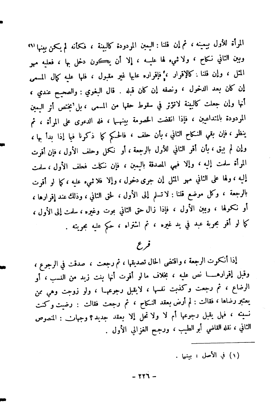 الْمَرْأَةُ لِلْأَوَّلِ بِيَمِينِهِ، ثُمَّ إِنْ قُلْنَا: الْيَمِينُ الْمَرْدُودَةُ كَالْبَيِّنَةِ، فَكَأَنَّهُ لَمْ يَكُنْ بَيْنَهَا وَبَيْنَ الثَّانِي نِكَاحٌ، وَلَا شَيْءَ لَهَا عَلَيْهِ، إِلَّا أَنْ يَكُونَ دَخَلَ بِهَا، فَعَلَيْهِ مَهْرُ الْمِثْلِ، وَإِنْ قُلْنَا: كَالْإِقْرَارِ، فَإِقْرَارُهُ عَلَيْهَا غَيْرُ مَقْبُولٍ، فَلَهَا عَلَيْهِ كَمَالِ الْمُسَمَّى إِنْ كَانَ بَعْدَ الدُّخُولِ، وَنِصْفُهُ إِنْ كَانَ قَبْلَهُ. قَالَ الْبَغَوِيُّ: وَالصَّحِيحُ عِنْدِي، أَنَّهَا وَإِنْ جُعِلَتْ كَالْبَيِّنَةِ لَا تُؤَثِّرُ فِي سُقُوطِ حَقِّهَا مِنَ الْمُسَمَّى، بَلْ يَخْتَصُّ أَثَرُ الْيَمِينِ الْمَرْدُودَةِ بِالْمُتَدَاعِيَيْنِ، فَإِذَا انْقَضَتِ الْخُصُومَةُ بَيْنَهُمَا، فَلَهُ الدَّعْوَى عَلَى الْمَرْأَةِ، ثُمَّ يُنْظَرُ، فَإِنْ بَقِيَ النِّكَاحُ الثَّانِي، بِأَنْ حَلَفَ، فَالْحُكْمُ كَمَا ذَكَرْنَا فِيمَا إِذَا بَدَأَ بِهَا، وَإِنْ لَمْ يَبْقَ، بِأَنْ أَقَرَّ الثَّانِي لِلْأَوَّلِ بِالرَّجْعَةِ، أَوْ نَكَلَ وَحَلَفَ الْأَوَّلُ، فَإِنْ أَقَرَّتِ الْمَرْأَةُ سُلِّمَتْ إِلَيْهِ، وَإِلَّا فَهِيَ الْمُصَدَّقَةُ بِالْيَمِينِ، فَإِنْ نَكَلَتْ فَحَلَفَ الْأَوَّلُ، سُلِّمَتْ إِلَيْهِ، وَلَهَا عَلَى الثَّانِي مَهْرُ الْمِثْلِ إِنْ جَرَى دُخُولٌ، وَإِلَّا فَلَا شَيْءَ عَلَيْهِ، كَمَا لَوْ أَقَرَّتْ بِالرَّجْعَةِ، وَكُلُّ مَوْضِعٍ قُلْنَا: لَا تُسَلَّمُ إِلَى الْأَوَّلِ، لِحَقِّ الثَّانِي، وَذَلِكَ عِنْدَ إِقْرَارِهَا، أَوْ نُكُولِهَا، وَيَمِينِ الْأَوَّلِ، فَإِذَا زَالَ حَقُّ الثَّانِي بِمَوْتٍ وَغَيْرِهِ، سُلِّمَتْ إِلَى الْأَوَّلِ، كَمَا لَوْ أَقَرَّ بِحُرِّيَّةِ عَبْدٍ فِي يَدِ غَيْرِهِ، ثُمَّ اشْتَرَاهُ، حُكِمَ عَلَيْهِ بِحُرِّيَّتِهِ.