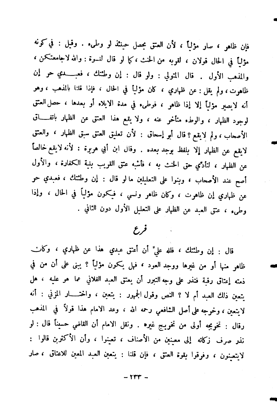 قَالَ: إِنْ وَطِئْتُكِ، فَلِلَّهِ عَلَيَّ أَنْ أَعْتِقَ عَبْدِي هَذَا عَنْ ظِهَارِي، وَكَانَ ظَاهَرَ مِنْهَا أَوْ مِنْ غَيْرِهَا وَوَجَدَ الْعَوْدَ، فَهَلْ يَكُونُ مُؤْلِيًا؟ يُبْنَى عَلَى أَنَّ مَنْ فِي ذِمَّتِهِ إِعْتَاقُ رَقَبَةٍ فَنَذَرَ عَلَى وَجْهِ التَّبَرُّرِ أَنْ يَعْتِقَ الْعَبْدَ الْفُلَانِيَّ عَمَّا هُوَ عَلَيْهِ، هَلْ يَتَعَيَّنُ ذَلِكَ الْعَبْدُ أَمْ لَا؟ النَّصُّ وَقَوْلُ الْجُمْهُورِ: يَتَعَيَّنُ، وَاخْتَارَ الْمُزَنِيُّ: أَنَّهُ لَا يَتَعَيَّنُ، وَخَرَّجَهُ عَلَى أَصْلِ الشَّافِعِيِّ - رَحِمَهُ اللَّهُ -، وَعَدَّ الْإِمَامُ هَذَا قَوْلًا فِي الْمَذْهَبِ وَقَالَ: تَخْرِيجُهُ أَوْلَى مِنْ تَخْرِيجِ غَيْرِهِ. وَنَقَلَ الْإِمَامُ أَنَّ الْقَاضِيَ حُسَيْنًا قَالَ: لَوْ نَذَرَ صَرْفَ زَكَاتِهِ إِلَى مُعَيَّنَيْنِ مِنَ الْأَصْنَافِ، تَعَيَّنُوا، وَأَنَّ الْأَكْثَرِينَ قَالُوا: لَا يَتَعَيَّنُونَ، وَفَرَّقُوا بِقُوَّةِ الْعِتْقِ، فَإِنْ قُلْنَا: يَتَعَيَّنُ الْعَبْدُ الْمُعَيَّنُ لِلْإِعْتَاقِ، صَارَ