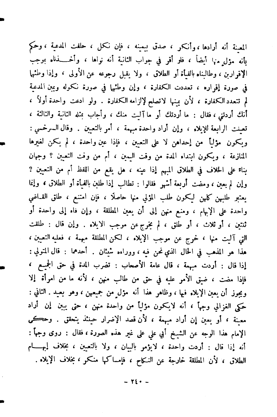 وَلَوِ ادَّعَتْ وَاحِدَةٌ أَوَّلًا، أَنَّكَ أَرَدْتَنِي، فَقَالَ: مَا أَرَدْتُكِ أَوْ مَا آلَيْتُ مِنْكِ، وَأَجَابَ بِمِثْلِهِ الثَّانِيَةَ وَالثَّالِثَةَ، تَعَيَّنَتِ الرَّابِعَةُ لِلْإِيلَاءِ، وَإِنْ أَرَادَ وَاحِدَةً مُبْهَمَةً، أُمِرَ بِالتَّعْيِينِ. وَقَالَ السَّرَخْسِيُّ: وَيَكُونُ مُؤْلِيًا مِنْ إِحْدَاهُنَّ لَا عَلَى التَّعْيِينِ، فَإِذَا عَيَّنَ وَاحِدَةً، لَمْ يَكُنْ لِغَيْرِهَا الْمُنَازَعَةُ، وَيَكُونُ ابْتِدَاءُ الْمُدَّةِ مِنْ وَقْتِ الْيَمِينِ، أَمْ مِنْ وَقْتِ التَّعْيِينِ؟ وَجْهَانِ بِنَاءً عَلَى الْخِلَافِ فِي الطَّلَاقِ الْمُبْهَمِ إِذَا عَيَّنَهُ، هَلْ يَقَعُ مِنَ اللَّفْظِ أَمْ مِنَ التَّعْيِينِ؟ وَإِنْ لَمْ يُعَيِّنْ، وَمَضَتْ أَرْبَعَةُ أَشْهُرٍ فَقَالُوا: تُطَالِبُ إِذَا طَلَبْنَ بِالْفَيْأَةِ أَوِ الطَّلَاقِ، وَإِنَّمَا يُعْتَبَرُ طَلَبُهُنَّ كُلِّهِنَّ لِيَكُونَ طَلَبُ الْمُؤْلِي مِنْهَا حَاصِلًا، فَإِنِ امْتَنَعَ، طَلَّقَ الْقَاضِي وَاحِدَةً عَلَى الْإِبْهَامِ، وَمُنِعَ مِنْهُنَّ إِلَى أَنْ يُعَيِّنَ الْمُطَلَّقَةَ، وَإِنْ فَاءَ إِلَى وَاحِدَةٍ أَوْ ثِنْتَيْنِ، أَوْ ثَلَاثٍ، أَوْ طَلَّقَ، لَمْ يَخْرُجْ عَنْ مُوجَبِ الْإِيلَاءِ. وَإِنْ قَالَ: طَلَّقْتُ الَّتِي آلَيْتُ مِنْهَا، خَرَجَ عَنْ مُوجَبِ الْإِيلَاءِ، لَكِنَّ الْمُطَلَّقَةَ مُبْهَمَةٌ، فَعَلَيْهِ التَّعْيِينُ، هَذَا هُوَ الْمَذْهَبُ فِي الْحَالِ الَّذِي نَحْنُ فِيهِ، وَوَرَاءَهُ شَيْئَانِ. أَحَدُهُمَا: قَالَ الْمُتَوَلِّي: إِذَا قَالَ: أَرَدْتُ مُبْهَمَةً، قَالَ عَامَّةُ الْأَصْحَابِ: تُضْرَبُ الْمُدَّةُ فِي حَقِّ الْجَمِيعِ، فَإِذَا مَضَتْ، ضُيِّقَ الْأَمْرُ عَلَيْهِ فِي حَقِّ مَنْ طَالَبَ مِنْهُنَّ، لِأَنَّهُ مَا مِنَ امْرَأَةٍ إِلَّا وَيَجُوزُ أَنْ يُعَيَّنَ الْإِيلَاءُ فِيهَا، وَظَاهِرُ هَذَا أَنَّهُ مُؤْلٍ مِنْ جَمِيعِهِنَّ، وَهُوَ بَعِيدٌ. الثَّانِي: حَكَى الْغَزَالِيُّ وَجْهًا، أَنَّهُ لَا يَكُونُ مُؤْلِيًا مِنْ وَاحِدَةٍ مِنْهُنَّ، حَتَّى يُبَيِّنَ إِنْ أَرَادَ مُعَيَّنَةً، أَوْ يُعَيِّنَ إِنْ أَرَادَ مُبْهَمَةً، لِأَنَّ قَصْدَ الْإِضْرَارِ حِينَئِذٍ يَتَحَقَّقُ.