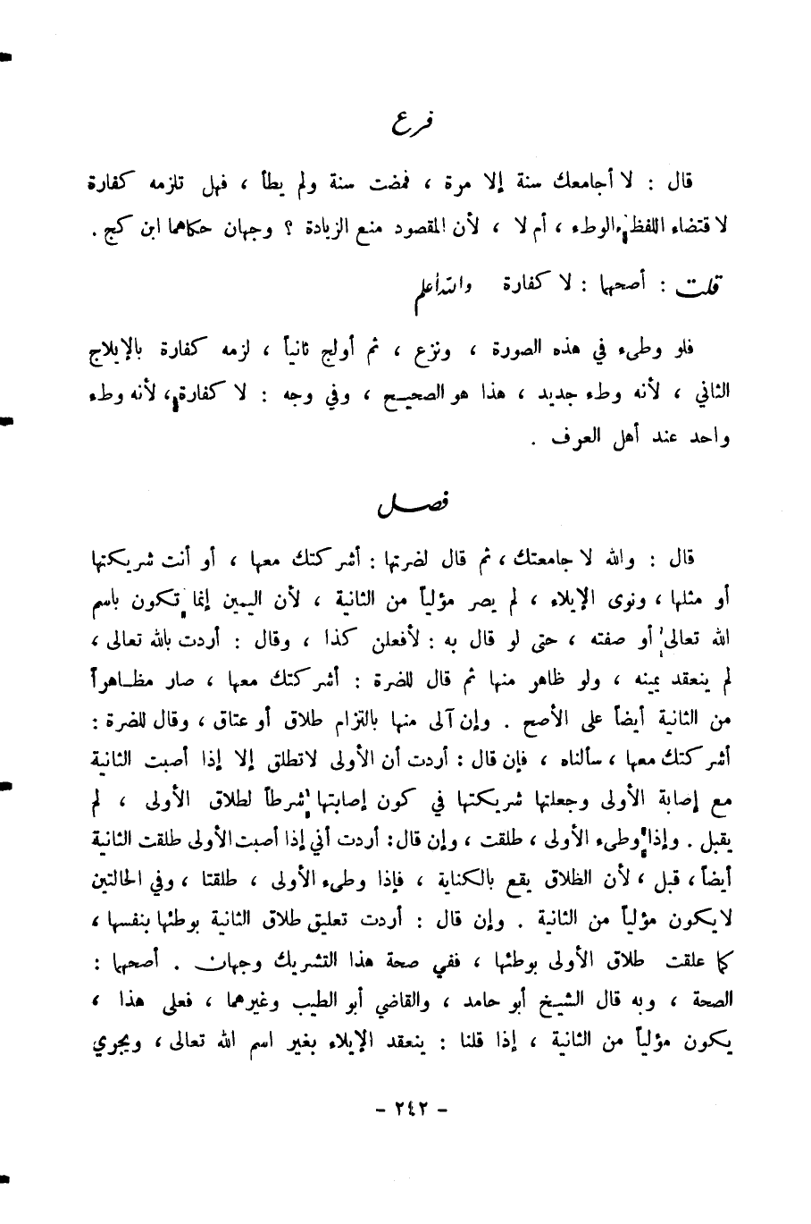 قَالَ: لَا أُجَامِعُكِ سَنَةً إِلَّا مَرَّةً، فَمَضَتْ سَنَةٌ وَلَمْ يَطَأْ، فَهَلْ تَلْزَمُهُ كَفَّارَةٌ لِاقْتِضَاءِ اللَّفْظِ الْوَطْءَ، أَمْ لَا، لِأَنَّ الْمَقْصُودَ مَنْعُ الزِّيَادَةِ؟ وَجْهَانِ حَكَاهُمَا ابْنُ كَجٍّ.