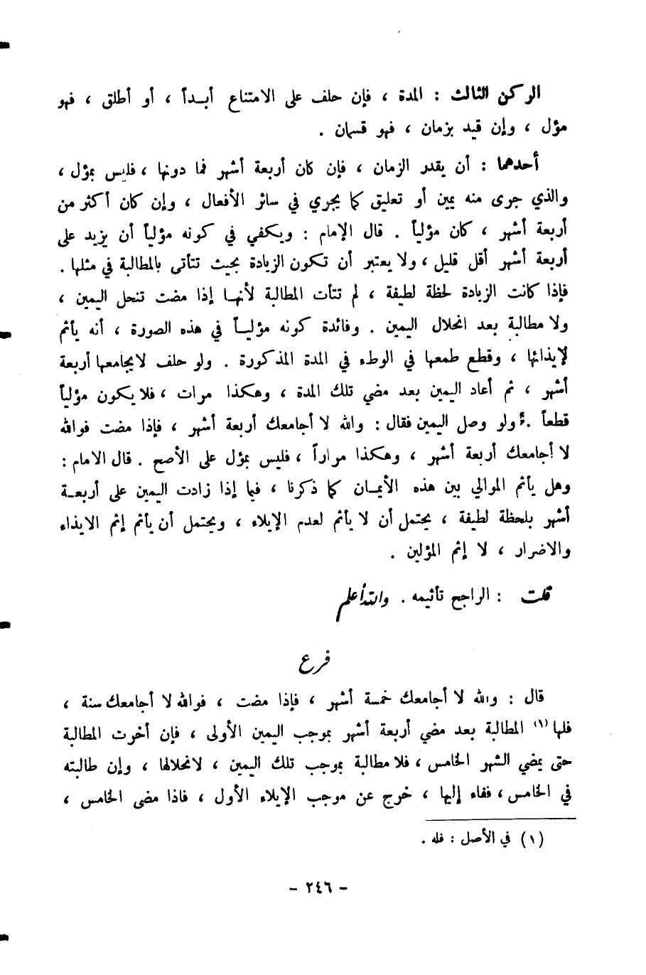 فَإِذَا كَانَتِ الزِّيَادَةُ لَحْظَةً لَطِيفَةً، لَمْ تَتَأَتَّ الْمُطَالَبَةُ لِأَنَّهَا إِذَا مَضَتْ تَنْحَلُّ الْيَمِينُ، وَلَا مُطَالَبَةَ بَعْدَ انْحِلَالِ الْيَمِينِ. وَفَائِدَةُ كَوْنِهِ مُؤْلِيًا فِي هَذِهِ الصُّورَةِ، أَنَّهُ يَأْثَمُ لِإِيذَائِهَا، وَقَطْعُ طَمَعِهَا فِي الْوَطْءِ فِي الْمُدَّةِ الْمَذْكُورَةِ.