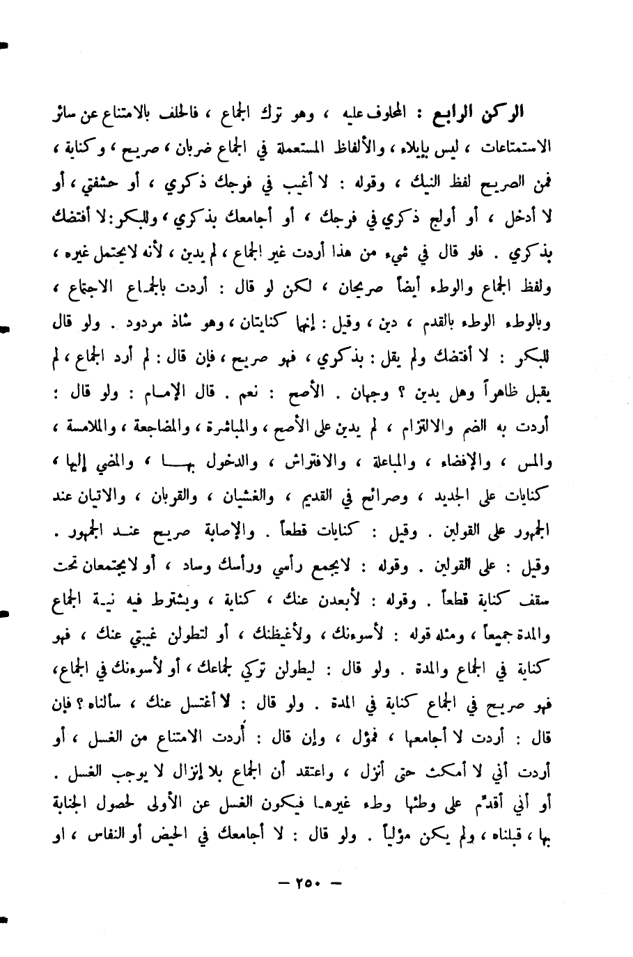 الرُّكْنُ الرَّابِعُ: الْمَحْلُوفُ عَلَيْهِ، وَهُوَ تَرْكُ الْجِمَاعِ، فَالْحَلِفُ بِالِامْتِنَاعِ عَنْ سَائِرِ الِاسْتِمْتَاعَاتِ، لَيْسَ بِإِيلَاءٍ، وَالْأَلْفَاظُ الْمُسْتَعْمَلَةُ فِي الْجِمَاعِ ضَرْبَانِ، صَرِيحٌ، وَكِنَايَةٌ، فَمِنَ الصَّرِيحِ لَفْظُ النَّيْكِ، وَقَوْلُهُ: لَا أُغَيِّبُ فِي فَرْجِكِ ذَكَرِي، أَوْ حَشَفَتِي، أَوْ لَا أُدْخِلُ، أَوْ أَوْلِجُ ذَكَرِي فِي فَرْجِكِ، أَوْ أُجَامِعُكِ بِذَكَرِي، وَلِلْبِكْرِ: لَا أَفْتَضُّكِ بِذَكَرِي. فَلَوْ قَالَ فِي شَيْءٍ مِنْ هَذَا أَرَدْتُ غَيْرَ الْجِمَاعِ، لَمْ يُدَيَّنْ، لِأَنَّهُ لَا يَحْتَمِلُ غَيْرَهُ، وَلَفْظُ الْجِمَاعِ وَالْوَطْءِ أَيْضًا صَرِيحَانِ، لَكِنْ لَوْ قَالَ: أَرَدْتُ بِالْجِمَاعِ الِاجْتِمَاعَ، وَبِالْوَطْءِ الْوَطْءَ بِالْقَدَمِ، دُيِّنَ، وَقِيلَ: إِنَّهُمَا كِنَايَتَانِ، وَهُوَ شَاذٌّ مَرْدُودٌ.