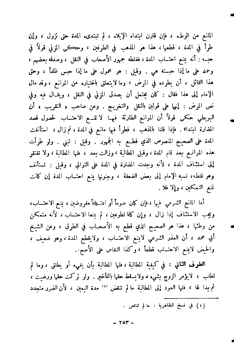 وَعَنْ صَاحِبِ «التَّقْرِيبِ» أَنَّ الْبُوَيْطِيَّ حَكَى قَوْلًا أَنَّ الْمَوَانِعَ الطَّارِئَةَ فِيهَا لَا تَمْنَعُ الِاحْتِسَابَ لِحُصُولِ قَصْدِ الْمُضَارَّةِ ابْتِدَاءً. فَإِذَا قُلْنَا بِالْمَذْهَبِ، فَطَرَأَ فِيهَا مَانِعٌ فِي الْمُدَّةِ، ثُمَّ زَالَ، اسْتَأْنَفَتِ الْمُدَّةَ عَلَى الصَّحِيحِ الْمَنْصُوصِ الَّذِي قَطَعَ بِهِ الْجُمْهُورُ.