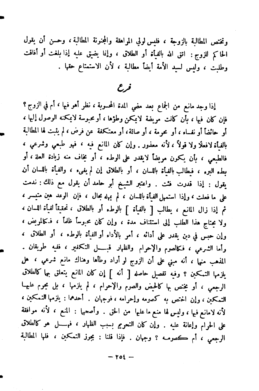 إِذَا وُجِدَ مَانِعٌ مِنَ الْجِمَاعِ بَعْدَ مُضِيِّ الْمُدَّةِ الْمَحْسُوبَةِ، نُظِرَ أَهْوَ فِيهَا، أَمْ فِي الزَّوْجِ؟ فَإِنْ كَانَ فِيهَا، بِأَنْ كَانَتْ مَرِيضَةً لَا يُمْكِنُ وَطْؤُهَا، أَوْ مَحْبُوسَةً لَا يُمْكِنُهُ الْوُصُولُ إِلَيْهَا، أَوْ حَائِضًا أَوْ نُفَسَاءَ، أَوْ مُحْرِمَةً، أَوْ صَائِمَةً، أَوْ مُعْتَكِفَةً عَنْ فَرْضٍ، لَمْ يَثْبُتْ لَهَا الْمُطَالَبَةُ بِالْفَيْأَةِ لَا فِعْلًا وَلَا قَوْلًا، لِأَنَّهُ مَعْذُورٌ. وَإِنْ كَانَ الْمَانِعُ فِيهِ، فَهُوَ طَبْعِيٌّ وَشَرْعِيٌّ، فَالطَّبْعِيُّ بِأَنْ يَكُونَ مَرِيضًا لَا يَقْدِرُ عَلَى الْوَطْءِ، أَوْ يُخَافَ مِنْهُ زِيَادَةُ الْعِلَّةِ، أَوْ بُطْءُ الْبُرْءِ، فَيُطَالَبُ بِالْفَيْأَةِ بِاللِّسَانِ، أَوْ بِالطَّلَاقِ إِنْ لَمْ يَفِئْ، وَالْفَيْأَةُ بِاللِّسَانِ أَنْ يَقُولَ: إِذَا قَدِرْتُ فِئْتُ. وَاعْتَبَرَ الشَّيْخُ أَبُو حَامِدٍ أَنْ يَقُولَ مَعَ ذَلِكَ: نَدِمْتُ عَلَى مَا فَعَلْتُ، وَإِذَا اسْتَمْهَلَ الْفَيْأَةَ بِاللِّسَانِ، لَمْ يُمْهِلْهُ بِحَالٍ، فَإِنَّ الْوَعْدَ هَيِّنٌ مُتَيَسِّرٌ، ثُمَّ إِذَا زَالَ الْمَانِعُ، يُطَالَبُ [بِالْفَيْأَةِ] بِالْوَطْءِ أَوْ بِالطَّلَاقِ، تَحْقِيقًا لِفِيَأَةِ اللِّسَانِ، وَلَا يَحْتَاجُ هَذَا الطَّلَبُ إِلَى اسْتِئْنَافِ مُدَّةٍ، وَإِنْ كَانَ مَحْبُوسًا ظُلْمًا، فَكَالْمَرِيضِ، وَإِنْ حُبِسَ فِي دَيْنٍ يَقْدِرُ عَلَى أَدَائِهِ، أُمِرَ بِالْأَدَاءِ أَوِ الْفَيْأَةِ بِالْوَطْءِ، أَوِ الطَّلَاقِ، وَأَمَّا الشَّرْعِيُّ، فَكَالصَّوْمِ وَالْإِحْرَامِ وَالظِّهَارِ قَبْلَ التَّكْفِيرِ، فَفِيهِ طَرِيقَانِ.
