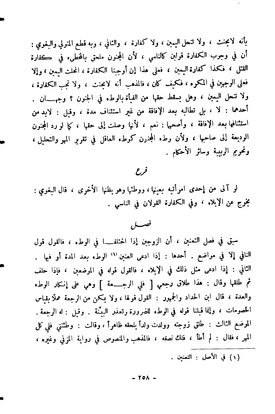 بِأَنَّهُ لَا يَحْنَثُ، وَلَا تَنْحَلُّ الْيَمِينُ، وَلَا كَفَّارَةَ، وَالثَّانِي، وَبِهِ قَطَعَ الْمُتَوَلِّي وَالْبَغَوِيُّ: أَنَّ فِي وُجُوبِ الْكَفَّارَةِ قَوْلَيْنِ كَالنَّاسِي، لِأَنَّ الْمَجْنُونَ مُلْحَقٌ بِالْمُخْطِئِ فِي كَفَّارَةِ الْقَتْلِ، فَكَذَا كَفَّارَةُ الْيَمِينِ، فَعَلَى هَذَا إِنْ أَوْجَبْنَا الْكَفَّارَةَ، انْحَلَّتِ الْيَمِينُ، وَإِلَّا فَعَلَى الْوَجْهَيْنِ فِي الْمُكْرَهِ، فَكَيْفَ كَانَ، فَالْمَذْهَبُ أَنَّهُ لَا يَحْنَثُ، وَلَا تَجِبُ الْكَفَّارَةُ، وَلَا تَنْحَلُّ الْيَمِينُ، وَهَلْ يَسْقُطُ حَقُّهَا مِنَ الْفَيْأَةِ بِالْوَطْءِ فِي الْجُنُونِ؟ وَجْهَانِ. أَحَدُهُمَا: لَا، بَلْ تُطَالِبُهُ بَعْدَ الْإِفَاقَةِ مِنْ غَيْرِ اسْتِئْنَافِ مُدَّةٍ، وَقِيلَ: لَا بُدَّ مِنَ اسْتِئْنَافِهَا بَعْدَ الْإِفَاقَةِ، وَأَصَحُّهُمَا: نَعَمْ، لِأَنَّهَا وَصَلَتْ إِلَى حَقِّهَا، كَمَا لَوْ رَدَّ الْمَجْنُونُ الْوَدِيعَةَ إِلَى صَاحِبِهَا، وَلِأَنَّ وَطْءَ الْمَجْنُونِ كَوَطْءِ الْعَاقِلِ فِي تَقْرِيرِ الْمَهْرِ وَالتَّحْلِيلِ، وَتَحْرِيمِ الرَّبِيبَةِ وَسَائِرِ الْأَحْكَامِ.