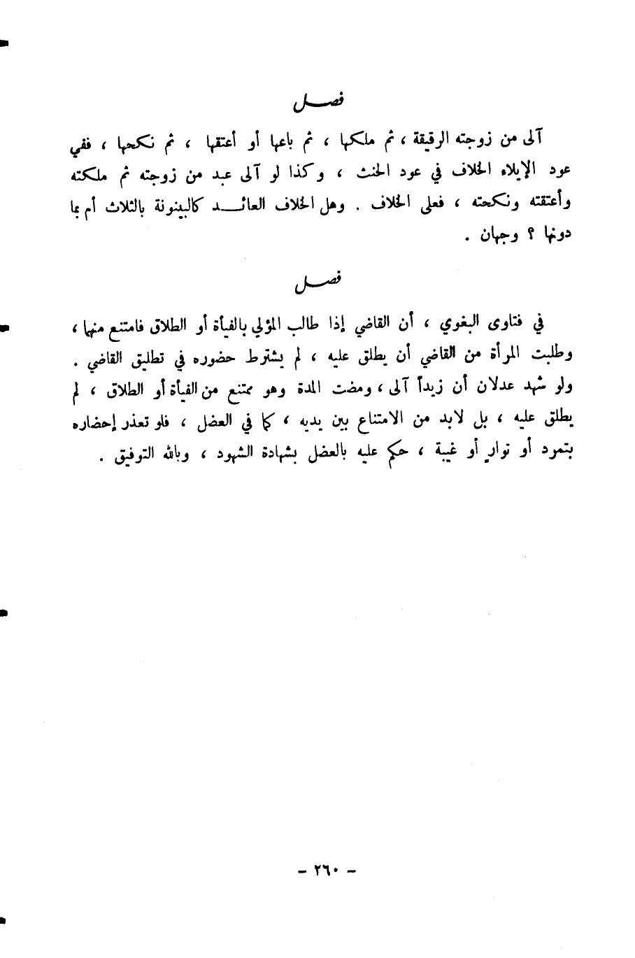 فِي فَتَاوَى الْبَغَوِيِّ، أَنَّ الْقَاضِيَ إِذَا طَالَبَ الْمُؤْلِيَ بِالْفَيْأَةِ أَوِ الطَّلَاقِ فَامْتَنَعَ مِنْهُمَا، وَطَلَبَتِ الْمَرْأَةُ مِنَ الْقَاضِي أَنْ يُطَلِّقَ عَلَيْهِ، لَمْ يُشْتَرَطْ حُضُورُهُ فِي تَطْلِيقِ الْقَاضِي. وَلَوْ شَهِدَ عَدْلَانِ أَنَّ زَيْدًا آلَى، وَمَضَتِ الْمُدَّةُ وَهُوَ مُمْتَنِعٌ مِنَ الْفَيْأَةِ أَوِ الطَّلَاقِ، لَمْ يُطَلَّقْ عَلَيْهِ، بَلْ لَا بُدَّ مِنَ الِامْتِنَاعِ بَيْنَ يَدَيْهِ، كَمَا فِي الْعَضْلِ، فَلَوْ تَعَذَّرَ إِحْضَارُهُ بِتَمَرُّدٍ أَوْ تَوَارٍ أَوْ غَيْبَةٍ، حُكِمَ عَلَيْهِ بِالْعَضْلِ بِشَهَادَةِ الشُّهُودِ، وَبِاللَّهِ التَّوْفِيقُ.