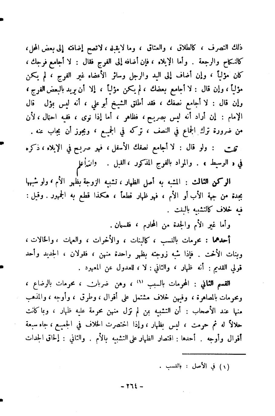الْقِسْمُ الثَّانِي: الْمُحَرَّمَاتُ بِالسَّبَبِ، وَهُنَّ ضَرْبَانِ، مُحَرَّمَاتٌ بِالرَّضَاعِ، وَمُحَرَّمَاتٌ بِالْمُصَاهَرَةِ، وَفِيهِنَّ خِلَافٌ مُشْتَمِلٌ عَلَى أَقْوَالٍ، وَطُرُقٍ، وَأَوْجُهٍ، وَالْمَذْهَبُ مِنْهَا عِنْدَ الْأَصْحَابِ: أَنَّ التَّشْبِيهَ بِمَنْ لَمْ تَزَلْ مِنْهُنَّ مُحَرَّمَةً عَلَيْهِ ظِهَارٌ، وَبِمَا كَانَتْ حَلَالًا لَهُ ثُمَّ حُرِّمَتْ، لَيْسَ بِظِهَارٍ، وَإِذَا اخْتَصَرْتُ الْخِلَافَ فِي الْجَمِيعِ، جَاءَ سَبْعَةُ أَقْوَالٍ وَأَوْجُهٍ. أَحَدُهَا: اقْتِصَارُ الظِّهَارُ عَلَى التَّشْبِيهِ بِالْأُمِّ. وَالثَّانِي: إِلْحَاقُ الْجَدَّاتِ