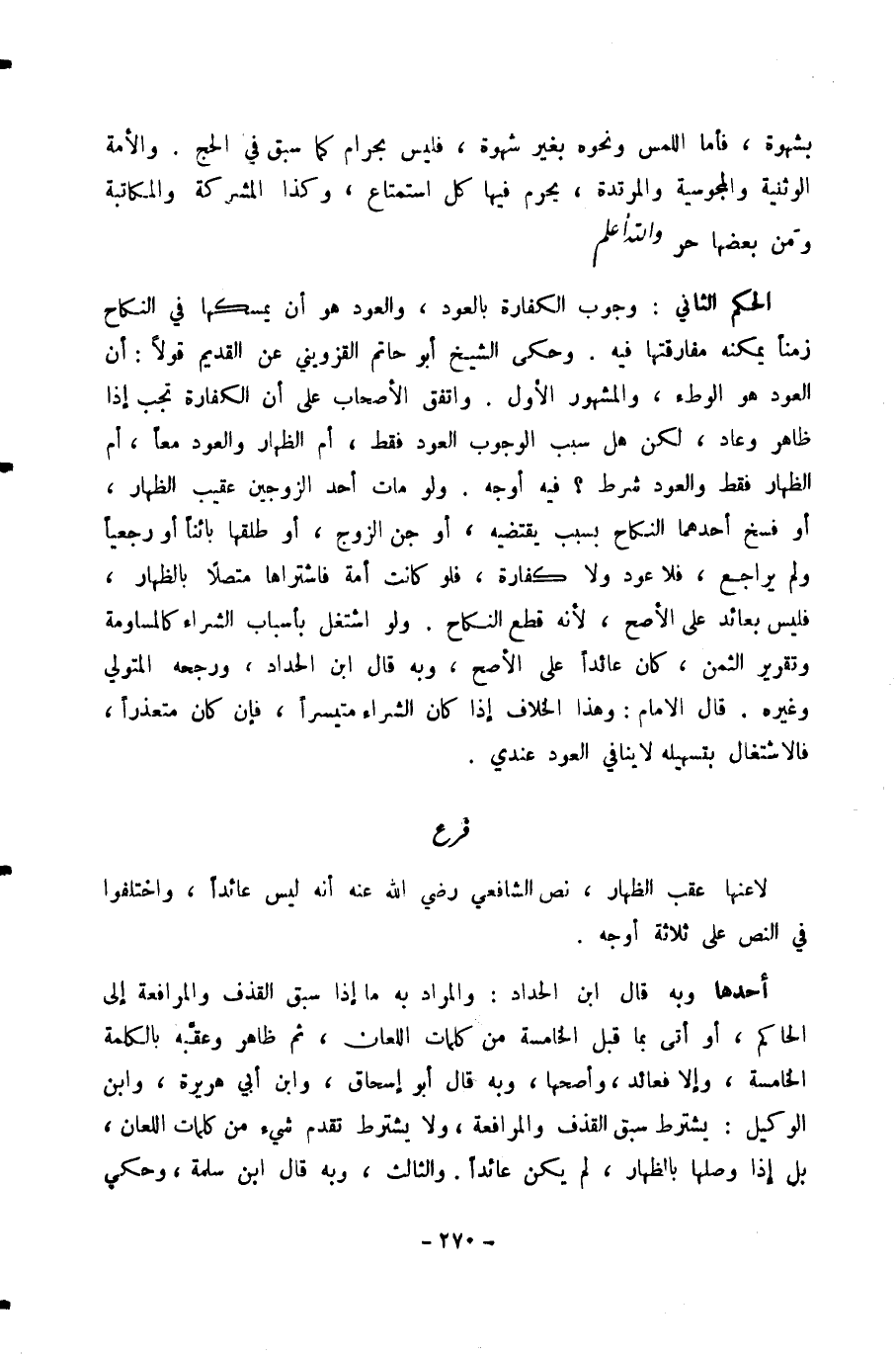 الْحُكْمُ الثَّانِي: وُجُوبُ الْكَفَّارَةِ بِالْعَوْدِ، وَالْعَوْدُ هُوَ أَنْ يُمْسِكَهَا فِي النِّكَاحِ زَمَنًا يُمْكِنُهُ مُفَارَقَتُهَا فِيهِ. وَحَكَى الشَّيْخُ أَبُو حَاتِمٍ الْقَزْوِينِيُّ عَنِ الْقَدِيمِ قَوْلًا: أَنَّ الْعَوْدَ هُوَ الْوَطْءُ، وَالْمَشْهُورُ الْأَوَّلُ. وَاتَّفَقَ الْأَصْحَابُ عَلَى أَنَّ الْكَفَّارَةَ تَجِبُ إِذَا ظَاهَرَ وَعَادَ، لَكِنْ هَلْ سَبَبُ الْوُجُوبِ الْعَوْدُ فَقَطْ، أَمِ الظِّهَارُ وَالْعَوْدُ مَعًا، أَمِ الظِّهَارُ فَقَطْ وَالْعَوْدُ شَرْطٌ؟ فِيهِ أَوْجُهٌ. وَلَوْ مَاتَ أَحَدُ الزَّوْجَيْنِ عُقَيْبَ الظِّهَارِ، أَوْ فَسَخَ أَحَدُهُمَا النِّكَاحَ بِسَبَبٍ يَقْتَضِيهِ، أَوْ جُنَّ الزَّوْجُ، أَوْ طَلَّقَهَا بَائِنًا أَوْ رَجْعِيًّا وَلَمْ يُرَاجِعْ، فَلَا عَوْدَ وَلَا كَفَّارَةَ، فَلَوْ كَانَتْ أَمَةً فَاشْتَرَاهَا مُتَّصِلًا بِالظِّهَارِ، فَلَيْسَ بِعَائِدٍ عَلَى الْأَصَحِّ، لِأَنَّهُ قَطَعَ النِّكَاحَ. وَلَوِ اشْتَغَلَ بِأَسْبَابِ الشِّرَاءِ كَالْمُسَاوَمَةِ وَتَقْرِيرِ الثَّمَنِ، كَانَ عَائِدًا عَلَى الْأَصَحِّ، وَبِهِ قَالَ ابْنُ الْحَدَّادِ، وَرَجَّحَهُ الْمُتَوَلِّي وَغَيْرُهُ. قَالَ الْإِمَامُ: وَهَذَا الْخِلَافُ إِذَا كَانَ الشِّرَاءُ مُتَيَسِّرًا، فَإِنْ كَانَ مُتَعَذِّرًا، فَالِاشْتِغَالُ بِتَسْهِيلِهِ لَا يُنَافِي الْعَوْدَ عِنْدِي.