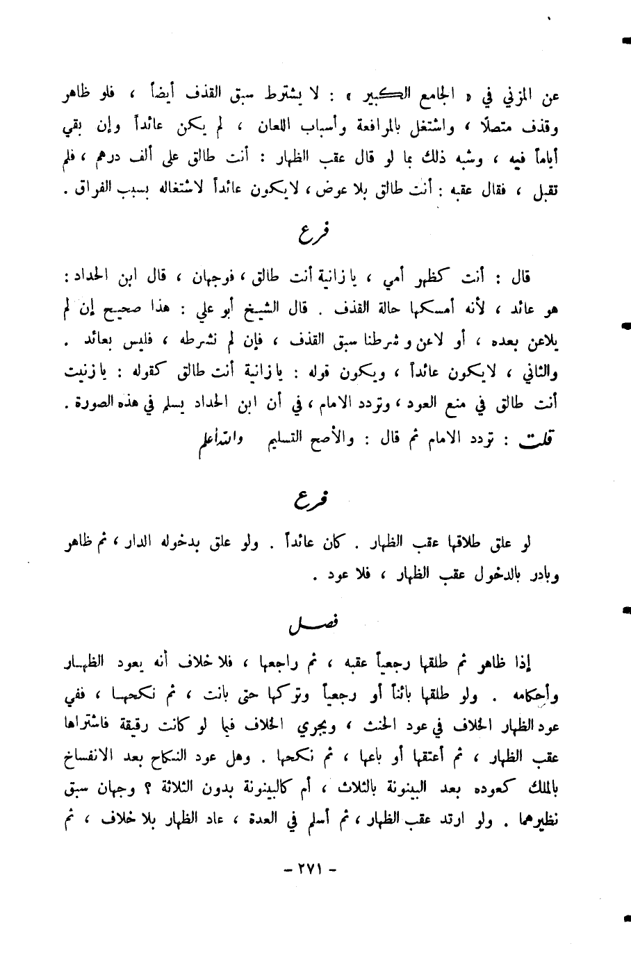 عَنِ الْمُزَنِيِّ فِي «الْجَامِعِ الْكَبِيرِ» : لَا يُشْتَرَطُ سَبْقُ الْقَذْفِ أَيْضًا، فَلَوْ ظَاهَرَ وَقَذَفَ مُتَّصِلًا، وَاشْتَغَلَ بِالْمُرَافَعَةِ وَأَسْبَابِ اللِّعَانِ، لَمْ يَكُنْ عَائِدًا وَإِنْ بَقِيَ أَيَّامًا فِيهِ، وَشَبَّهَ ذَلِكَ بِمَا لَوْ قَالَ عَقِبَ الظِّهَارِ: أَنْتِ طَالِقٌ عَلَى أَلْفِ دِرْهَمٍ، فَلَمْ تَقْبَلْ، فَقَالَ عَقِبَهُ: أَنْتِ طَالِقٌ بِلَا عِوَضٍ، لَا يَكُونُ عَائِدًا لِاشْتِغَالِهِ بِسَبَبِ الْفِرَاقِ.