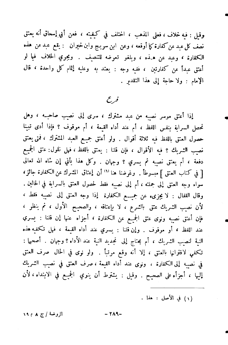 وَغَرَضُنَا هُنَا أَنَّ إِعْتَاقَ الْمُشْرِكِ عَنِ الْكَفَّارَةِ جَائِزٌ، سَوَاءٌ وَجَّهَ الْعِتْقَ إِلَى جُمْلَتِهِ، أَمْ إِلَى نَصِيبِهِ فَقَطْ لِحُصُولِ الْعِتْقِ بِالسِّرَايَةِ فِي الْحَالَيْنِ. وَقَالَ الْقَفَّالُ: لَا يُجْزِئُ عَنْ جَمِيعِ الْكَفَّارَةِ إِذَا وَجَّهَ الْعِتْقَ إِلَى نَصِيبِهِ فَقَطْ، لِأَنَّ نَصِيبَ الشَّرِيكِ عَتَقَ بِالشَّرْعِ، لَا بِإِعْتَاقِهِ، وَالصَّحِيحُ الْأَوَّلُ، ثُمَّ يَنْظُرُ، فَإِنْ أَعْتَقَ نَصِيبَهُ وَنَوَى عِتْقَ الْجَمِيعِ عَنِ الْكَفَّارَةِ، أَجْزَاهُ عَنْهَا إِنْ قُلْنَا: يَسْرِي عِنْدَ اللَّفْظِ، أَوْ مَوْقُوفٌ. وَإِنْ قُلْنَا: يَسْرِي عِنْدَ أَدَاءِ الْقِيمَةِ، فَهَلْ تَكْفِيهِ هَذِهِ النِّيَّةُ لِنَصِيبِ الشَّرِيكِ، أَمْ يَحْتَاجُ إِلَى تَجْدِيدِ النِّيَّةِ عِنْدَ الْأَدَاءِ؟ وَجْهَانِ. أَصَحُّهُمَا: تَكْفِي لِاقْتِرَانِهَا بِالْعِتْقِ، إِلَّا أَنَّهُ وَقَعَ مُرَتَّبًا.
