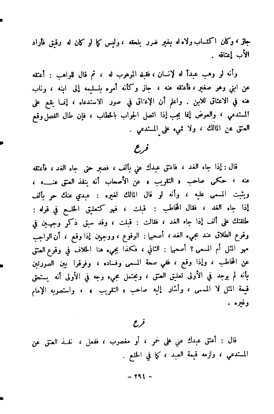 وَأَنَّهُ لَوْ وَهَبَ عَبْدًا لَهُ لِإِنْسَانٍ، فَقَبِلَهُ الْمَوْهُوبُ لَهُ، ثُمَّ قَالَ لِلْوَاهِبِ: أَعْتِقْهُ عَنِ ابْنِي وَهُوَ صَغِيرٌ، فَأَعْتَقَهُ عَنْهُ، جَازَ وَكَأَنَّهُ أَمَرَهُ بِتَسْلِيمِهِ إِلَى ابْنِهِ، وَنَابَ عَنْهُ فِي الْإِعْتَاقِ لِلِابْنِ. وَاعْلَمْ أَنَّ الْإِعْتَاقَ فِي صُوَرِ الِاسْتِدْعَاءِ، إِنَّمَا يَقَعُ عَلَى الْمُسْتَدْعِي، وَالْعِوَضُ إِنَّمَا يَجِبُ إِذَا اتَّصَلَ الْجَوَابُ بِالْخِطَابِ، فَإِنْ طَالَ الْفَصْلُ وَقَعَ الْعِتْقُ عَنِ الْمَالِكِ، وَلَا شَيْءَ عَلَى الْمُسْتَدْعِي.