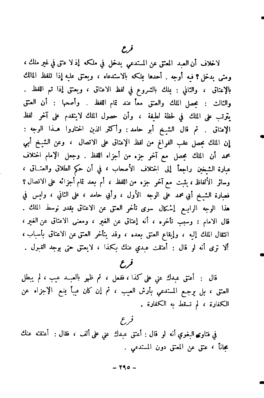 وَجَعَلَ الْإِمَامُ اخْتِلَافَ عِبَارَةِ الشَّيْخَيْنِ رَاجِعًا إِلَى اخْتِلَافِ الْأَصْحَابِ، فِي أَنَّ حُكْمَ الطَّلَاقِ وَالْعَتَاقِ، وَسَائِرِ الْأَلْفَاظِ، يَثْبُتُ مَعَ آخِرِ جُزْءٍ مِنَ اللَّفْظِ، أَمْ بَعْدَ تَمَامِ أَجْزَائِهِ عَلَى الِاتِّصَالِ؟ فَعِبَارَةُ الشَّيْخِ أَبِي مُحَمَّدٍ عَلَى الْوَجْهِ الْأَوَّلِ، وَأَبِي حَامِدٍ، عَلَى الثَّانِي، وَلَيْسَ فِي هَذَا الْوَجْهِ الرَّابِعِ إِشْكَالٌ سِوَى تَأَخُّرِ الْعِتْقِ عَنِ الْإِعْتَاقِ بِقَدْرِ تَوَسُّطِ الْمِلْكِ.