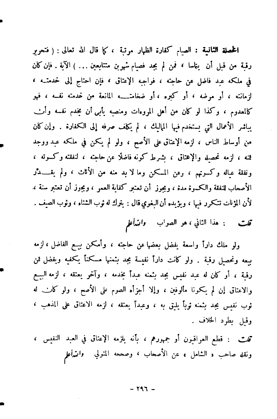 الْخَصْلَةُ الثَّانِيَةُ: الصِّيَامُ كَفَّارَةُ الظِّهَارِ مُرَتَّبَةٌ، كَمَا قَالَ اللَّهُ تَعَالَى: (فَتَحْرِيرُ رَقَبَةٍ مِنْ قَبْلِ أَنْ يَتَمَاسَّا، فَمَنْ لَمْ يَجِدْ فَصِيَامُ شَهْرَيْنِ مُتَتَابِعَيْنِ) الْآيَةَ. فَإِنْ كَانَ فِي مِلْكِهِ عَبْدٌ فَاضِلٌ عَنْ حَاجَتِهِ، فَوَاجِبُهُ الْإِعْتَاقُ، فَإِنِ احْتَاجَ إِلَى خِدْمَتِهِ، لِزَمَانَتِهِ، أَوْ مَرَضِهِ، أَوْ كِبَرِهِ، أَوْ ضَخَامَتِهِ الْمَانِعَةِ مَنْ خِدْمَتِهِ نَفْسَهُ، فَهُوَ كَالْمَعْدُومِ، وَكَذَا لَوْ كَانَ مِنْ أَهْلِ الْمُرُوءَاتِ وَمَنْصِبُهُ يَأْبَى أَنْ يَخْدِمَ نَفْسَهُ وَأَنْ يُبَاشِرَ الْأَعْمَالَ الَّتِي يُسْتَخْدَمُ فِيهَا الْمَمَالِيكُ، لَمْ يُكَلَّفْ صَرْفَهُ إِلَى الْكَفَّارَةِ. وَإِنْ كَانَ مِنْ أَوْسَاطِ النَّاسِ، لَزِمَهُ الْإِعْتَاقُ عَلَى الْأَصَحِّ، وَلَوْ لَمْ يَكُنْ فِي مِلْكِهِ عَبْدٌ وَوَجَدَ ثَمَنَهُ، لَزِمَهُ تَحْصِيلُهُ وَالْإِعْتَاقُ، بِشَرْطِ كَوْنِهِ فَاضِلًا عَنْ حَاجَتِهِ، لِنَفَقَتِهِ وَكُسْوَتِهِ، وَنَفَقَةِ عِيَالِهِ وَكُسْوَتِهِمْ، وَعَنِ الْمَسْكَنِ وَمَا لَا بُدَّ مِنْهُ مِنَ الْأَثَاثِ، وَلَمْ يُقَدِّرِ الْأَصْحَابُ لِلنَّفَقَةِ وَالْكُسْوَةِ مُدَّةً، وَيَجُوزُ أَنْ تُعْتَبَرَ كِفَايَةَ الْعُمُرِ، وَيَجُوزُ أَنْ تُعْتَبَرَ سَنَةً، لِأَنَّ الْمُؤْنَاتِ تَتَكَرَّرُ فِيهَا، وَيُؤَيِّدُهُ أَنَّ الْبَغَوِيَّ قَالَ: يَتْرُكُ لَهُ ثَوْبَ الشِّتَاءِ، وَثَوْبَ الصَّيْفِ.