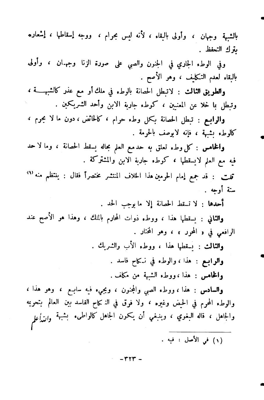 وَالْخَامِسُ: كُلُّ وَطْءٍ تَعَلَّقَ بِهِ حَدٌّ مَعَ الْعِلْمِ بِحَالِهِ يُسْقِطُ الْحَصَانَةَ، وَمَا لَا حَدَّ فِيهِ مَعَ الْعِلْمِ لَا يُسْقِطُهَا، كَوَطْءِ جَارِيَةِ الِابْنِ وَالْمُشْتَرَكَةِ.