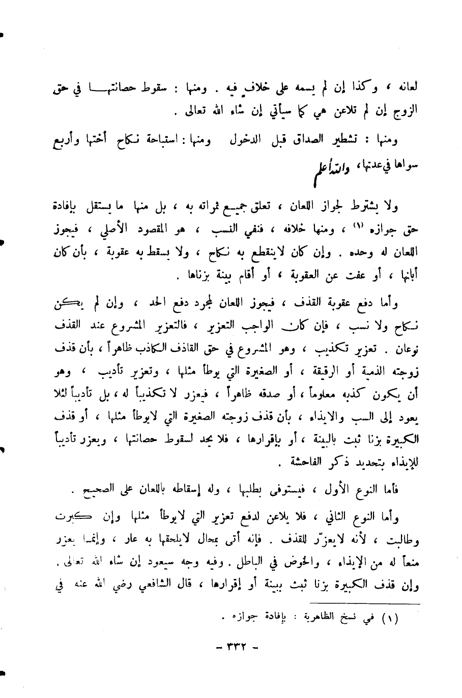 وَأَمَّا النَّوْعُ الثَّانِي، فَلَا يُلَاعِنُ لِدَفْعِ تَعْزِيرِ الَّتِي لَا يُوطَأُ مِثْلُهَا وَإِنْ كَبُرَتْ وَطَالَبَتْ، لِأَنَّهُ لَا يُعَزَّرُ لِلْقَذْفِ. فَإِنَّهُ أَتَى بِمُحَالٍ لَا يَلْحَقُهَا بِهِ عَارٌ، وَإِنَّمَا يُعَزَّرُ مَنْعًا لَهُ مِنَ الْإِيذَاءِ، وَالْخَوْضِ فِي الْبَاطِلِ. وَفِيهِ وَجْهٌ سَيَعُودُ إِنْ شَاءَ اللَّهُ تَعَالَى. وَإِنْ قَذَفَ الْكَبِيرَةَ بِزِنًا ثَبَتَ بِبَيِّنَةٍ أَوْ إِقْرَارِهَا، قَالَ الشَّافِعِيُّ رَضِيَ اللَّهُ عَنْهُ فِي