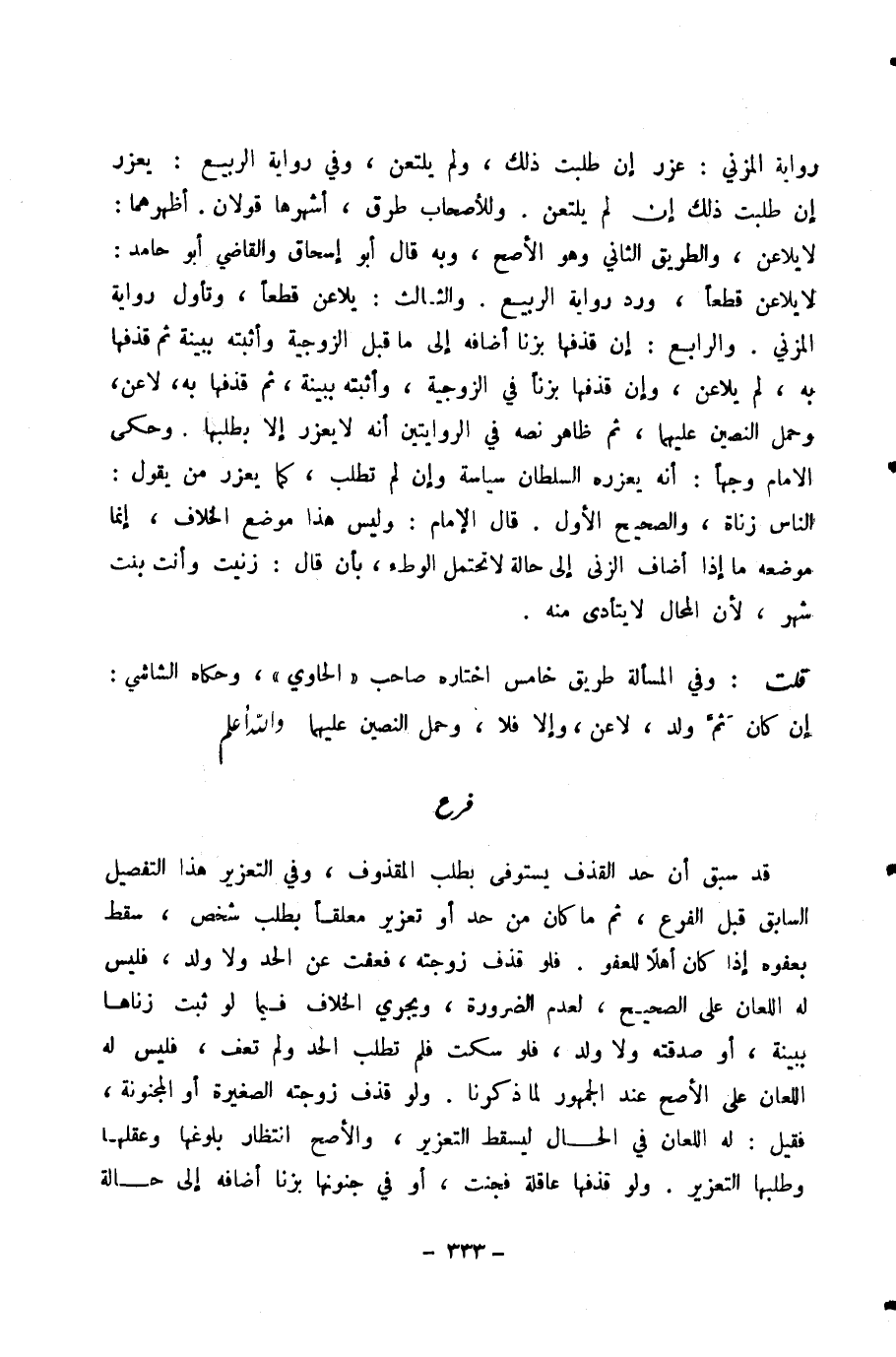 رِوَايَةِ الْمُزَنِيِّ: عُزِّرَ إِنْ طَلَبَتْ ذَلِكَ، وَلَمْ يَلْتَعِنْ، وَفِي رِوَايَةِ الرَّبِيعِ: يُعَزَّرُ إِنْ طَلَبَتْ ذَلِكَ إِنْ لَمْ يَلْتَعِنْ. وَلِلْأَصْحَابِ طُرُقٌ، أَشْهَرُهَا قَوْلَانِ. أَظْهَرُهُمَا: لَا يُلَاعِنُ، وَالطَّرِيقُ الثَّانِي وَهُوَ الْأَصَحُّ، وَبِهِ قَالَ أَبُو إِسْحَاقَ وَالْقَاضِي أَبُو حَامِدٍ: لَا يُلَاعِنُ قَطْعًا، وَرَدَّ رِوَايَةَ الرَّبِيعِ. وَالثَّالِثُ: يُلَاعِنُ قَطْعًا، وَتَأَوَّلَ رِوَايَةَ الْمُزَنِيِّ. وَالرَّابِعُ: إِنَّ قَذْفَهَا بِزِنًا أَضَافَهُ إِلَى مَا قَبْلَ الزَّوْجِيَّةِ وَأَثْبَتَهُ بِبَيِّنَةٍ ثُمَّ قَذَفَهَا بِهِ، لَمْ يُلَاعِنْ، وَإِنْ قَذَفَهَا بِزِنًا فِي الزَّوْجِيَّةِ، وَأَثْبَتَهُ بِبَيِّنَةٍ، ثُمَّ قَذَفَهَا بِهِ، لَاعَنَ، وَحَمَلَ النَّصَّيْنِ عَلَيْهِمَا، ثُمَّ ظَاهَرُ نَصِّهِ فِي الرِّوَايَتَيْنِ أَنَّهُ لَا يُعَزَّرُ إِلَّا بِطَلَبِهَا. وَحَكَى الْإِمَامُ وَجْهًا: أَنَّهُ يُعَزِّرُهُ السُّلْطَانُ سِيَاسَةً وَإِنْ لَمْ تَطْلُبْ، كَمَا يُعَزِّرُ مَنْ يَقُولُ: النَّاسُ زُنَاةٌ، وَالصَّحِيحُ الْأَوَّلُ. قَالَ الْإِمَامُ: وَلَيْسَ هَذَا مَوْضِعَ الْخِلَافِ، إِنَّمَا مَوْضِعُهُ مَا إِذَا أَضَافَ الزِّنَا إِلَى حَالَةٍ لَا تَحْتَمِلُ الْوَطْءَ، بِأَنْ قَالَ: زَنَيْتِ وَأَنْتِ بِنْتُ شَهْرٍ، لِأَنَّ الْمُحَالَ لَا يَتَأَدَّى مِنْهُ.