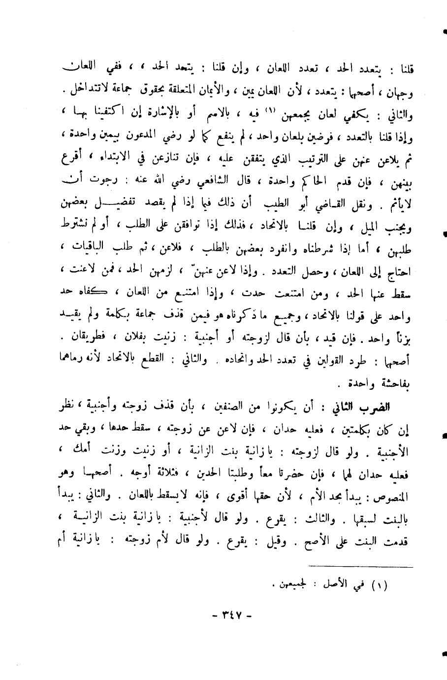 وَنَقَلَ الْقَاضِي أَبُو الطَّيِّبِ أَنَّ ذَلِكَ فِيمَا إِذَا لَمْ يَقْصِدْ تَفْضِيلَ بَعْضِهِنَّ وَيُجَنَّبُ الْمَيْلُ، وَإِنْ قُلْنَا بِالِاتِّحَادِ، فَذَلِكَ إِذَا تَوَافَقْنَ عَلَى الطَّلَبِ، أَوْ لَمْ نَشْتَرِطْ طَلَبَهُنَّ، أَمَّا إِذَا شَرَطْنَاهُ وَانْفَرَدَ بَعْضُهُنَّ بِالطَّلَبِ، فَلَاعَنَ، ثُمَّ طَلَبَ الْبَاقِيَاتُ، احْتَاجَ إِلَى اللِّعَانِ، وَحَصَلَ التَّعَدُّدُ. وَإِذَا لَاعَنَ عَنْهُنَّ، لَزِمَهُنَّ الْحَدُّ، فَمَنْ لَاعَنَتْ، سَقَطَ عَنْهَا الْحَدُّ، وَمَنِ امْتَنَعَتْ حُدَّتْ، وَإِذَا امْتَنَعَ مِنَ اللِّعَانِ، كَفَاهُ حَدٌّ وَاحِدٌ عَلَى قَوْلِنَا بِالِاتِّحَادِ، وَجَمِيعُ مَا ذَكَرْنَاهُ هُوَ فِيمَنْ قَذَفَ جَمَاعَةً بِكَلِمَةٍ وَلَمْ يُقَيِّدْ بِزِنَا وَاحِدٍ. فَإِنْ قَيَّدَ، بِأَنْ قَالَ لِزَوْجَتِهِ أَوْ أَجْنَبِيَّةٍ: زَنَيْتِ بِفُلَانٍ، فَطَرِيقَانِ. أَصَحُّهُمَا: طَرْدُ الْقَوْلَيْنِ فِي تَعَدُّدِ الْحَدِّ وَاتِّحَادِهِ. وَالثَّانِي: الْقَطْعُ بِالِاتِّحَادِ لِأَنَّهُ رَمَاهُمَا بِفَاحِشَةٍ وَاحِدَةٍ.