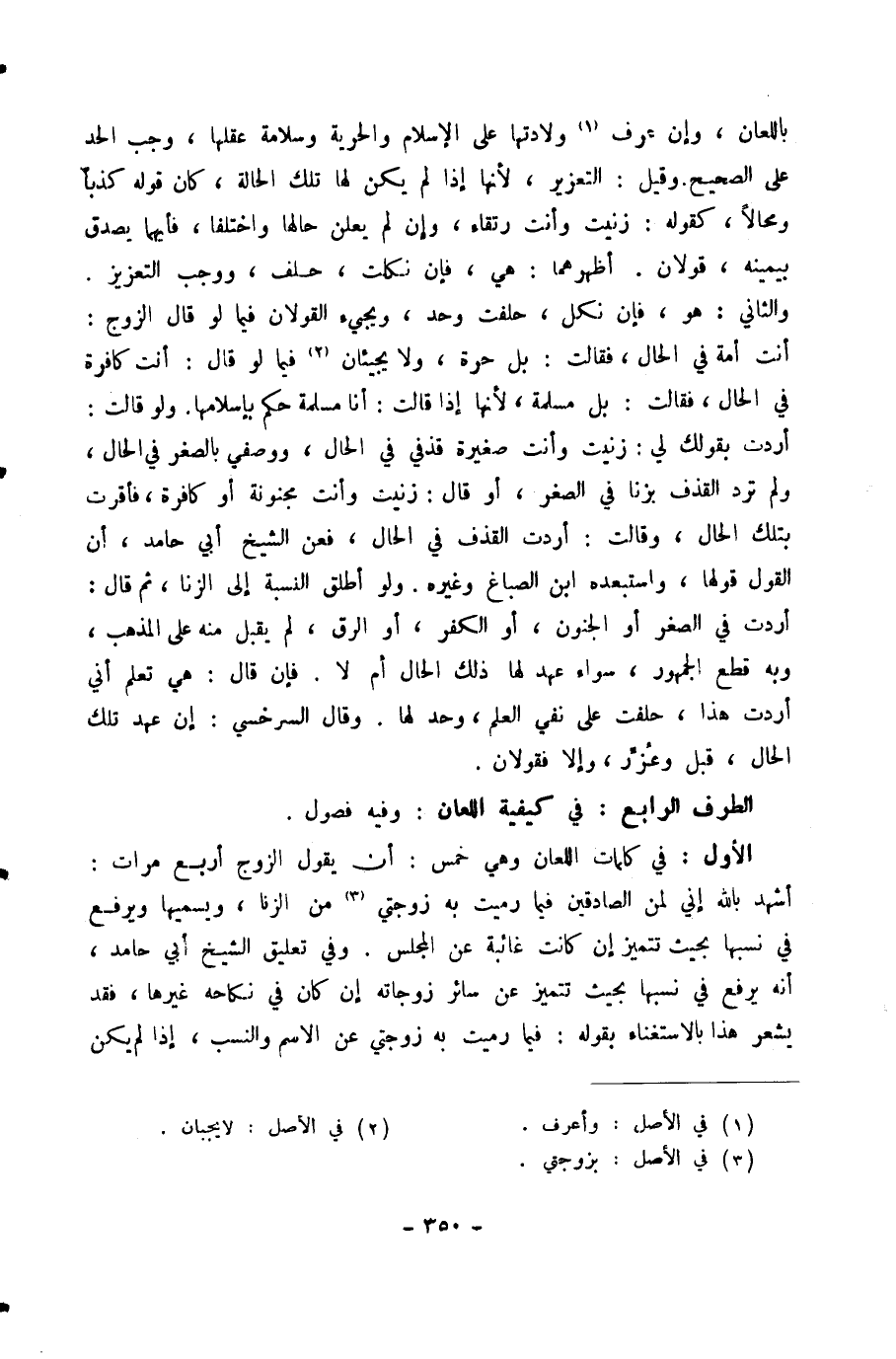الْأَوَّلُ: فِي كَلِمَاتِ اللِّعَانِ وَهِيَ خَمْسٌ: أَنْ يَقُولَ الزَّوْجُ أَرْبَعَ مَرَّاتٍ: أَشْهَدُ بِاللَّهِ إِنِّي لَمِنَ الصَّادِقِينَ فِيمَا رَمَيْتُ بِهِ زَوْجَتِي مِنَ الزِّنَا، وَيُسَمِّيهَا وَيَرْفَعُ فِي نَسَبِهَا بِحَيْثُ تَتَمَيَّزُ إِنْ كَانَتْ غَائِبَةً عَنِ الْمَجْلِسِ. وَفِي تَعْلِيقِ الشَّيْخِ أَبِي حَامِدٍ، أَنَّهُ يَرْفَعُ فِي نَسَبِهَا بِحَيْثُ تَتَمَيَّزُ عَنْ سَائِرِ زَوْجَاتِهِ إِنْ كَانَ فِي نِكَاحِهِ غَيْرُهَا، فَقَدْ يُشْعِرُ هَذَا بِالِاسْتِغْنَاءِ بِقَوْلِهِ: فِيمَا رَمَيْتُ بِهِ زَوْجَتِي عَنِ الِاسْمِ وَالنَّسَبِ، إِذَا لَمْ يَكُنْ