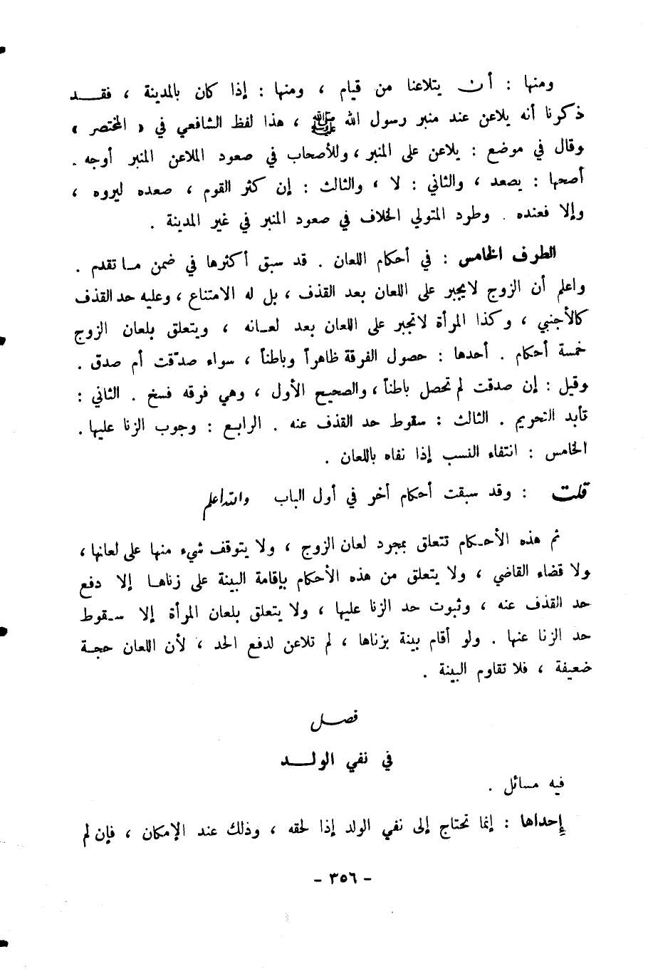 الطَّرَفُ الْخَامِسُ: فِي أَحْكَامِ اللِّعَانِ. قَدْ سَبَقَ أَكْثَرُهَا فِي ضِمْنِ مَا تَقَدَّمَ. وَاعْلَمْ أَنَّ الزَّوْجَ لَا يُجْبَرُ عَلَى اللِّعَانِ بَعْدَ الْقَذْفِ، بَلْ لَهُ الِامْتِنَاعُ، وَعَلَيْهِ حَدُّ الْقَذْفِ كَالْأَجْنَبِيِّ، وَكَذَا الْمَرْأَةُ لَا تُجْبَرُ عَلَى اللِّعَانِ بَعْدَ لِعَانِهِ، وَيَتَعَلَّقُ بِلِعَانِ الزَّوْجِ خَمْسَةُ أَحْكَامٍ. أَحُدُهَا: حُصُولُ الْفُرْقَةِ ظَاهِرًا وَبَاطِنًا، سَوَاءٌ صُدِّقَتْ أَمْ صُدِّقَ. وَقِيلَ: إِنْ صُدِّقَتْ لَمْ تَحْصُلْ بَاطِنًا، وَالصَّحِيحُ الْأَوَّلُ، وَهِيَ فُرْقَةُ فَسْخٍ. الثَّانِي: تَأَبَّدُ التَّحْرِيمِ. الثَّالِثُ: سُقُوطُ حَدِّ الْقَذْفِ عَنْهُ. الرَّابِعُ: وُجُوبُ الزِّنَا عَلَيْهَا. الْخَامِسُ: انْتِفَاءُ النَّسَبِ إِذَا نَفَاهُ بِاللِّعَانِ.