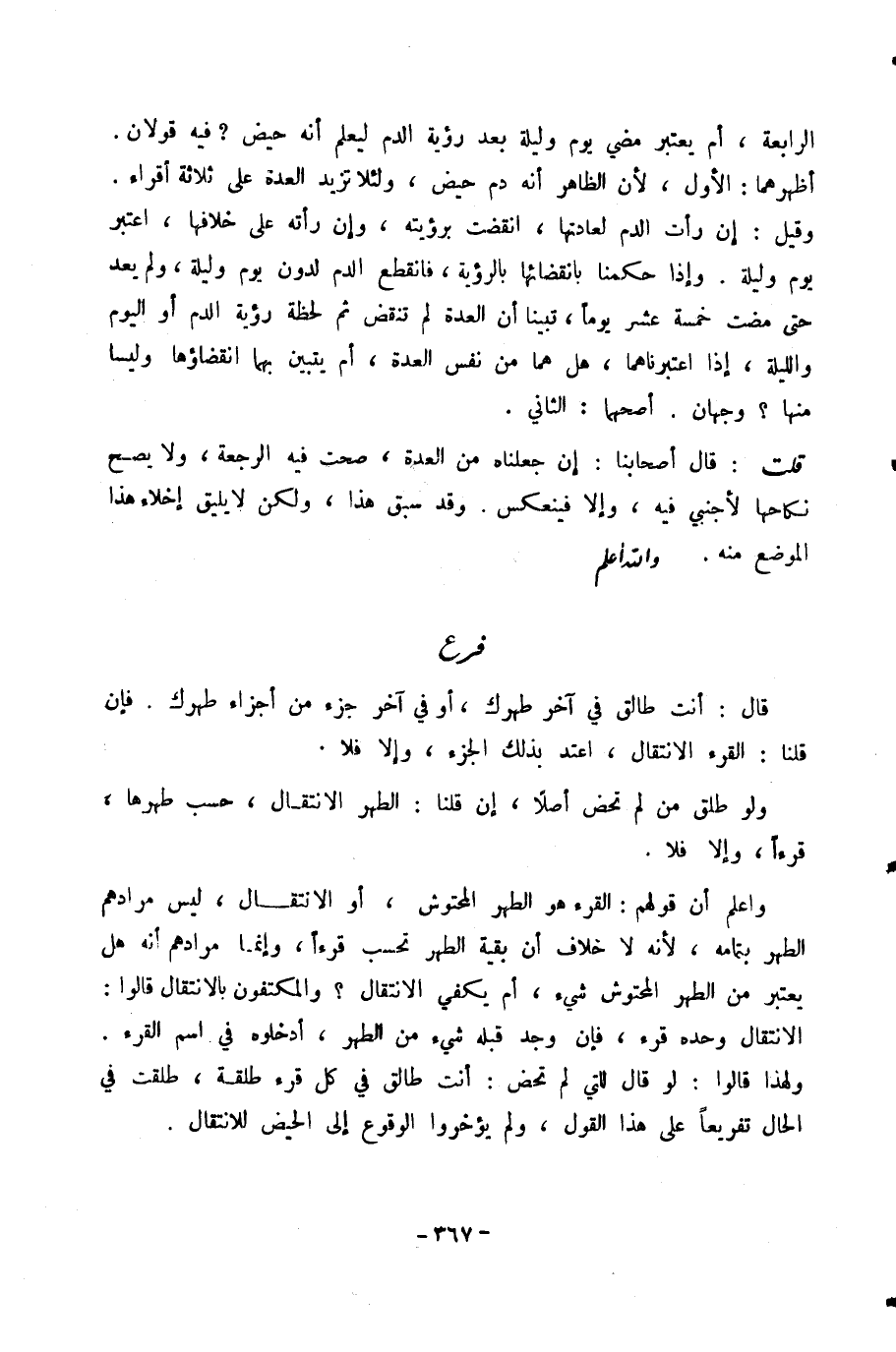 الرَّابِعَةِ، أَمْ يُعْتَبَرُ مُضِيُّ يَوْمٍ وَلَيْلَةٍ بَعْدَ رُؤْيَةِ الدَّمِ لِيُعْلَمَ أَنَّهُ حَيْضٌ؟ فِيهِ قَوْلَانِ. أَظْهَرُهُمَا: الْأَوَّلُ، لِأَنَّ الظَّاهِرَ أَنَّهُ دَمُ حَيْضٍ، وَلِئَلَّا تَزِيدَ الْعِدَّةُ عَلَى ثَلَاثَةِ أَقْرَاءٍ. وَقِيلَ: إِنْ رَأَتِ الدَّمَ لِعَادَتِهَا، انْقَضَتْ بِرُؤْيَتِهِ، وَإِنْ رَأَتْهُ عَلَى خِلَافِهَا، اعْتُبِرَ يَوْمٌ وَلَيْلَةٌ. وَإِذَا حَكَمْنَا بِانْقِضَائِهَا بِالرُّؤْيَةِ، فَانْقَطَعَ الدَّمُ لِدُونِ يَوْمٍ وَلَيْلَةٍ، وَلَمْ يَعُدْ حَتَّى مَضَتْ خَمْسَةَ عَشَرَ يَوْمًا، تَبَيَّنَّا أَنَّ الْعِدَّةَ لَمْ تَنْقَضِ، ثُمَّ لَحْظَةُ رُؤْيَةِ الدَّمِ أَوِ الْيَوْمُ وَاللَّيْلَةُ إِذَا اعْتَبَرْنَاهُمَا، هَلْ هُمَا مِنْ نَفْسِ الْعِدَّةِ، أَمْ يَتَبَيَّنُ بِهِمَا انْقِضَاؤُهَا وَلَيْسَا مِنْهَا؟ وَجْهَانِ. أَصَحُّهُمَا: الثَّانِي.