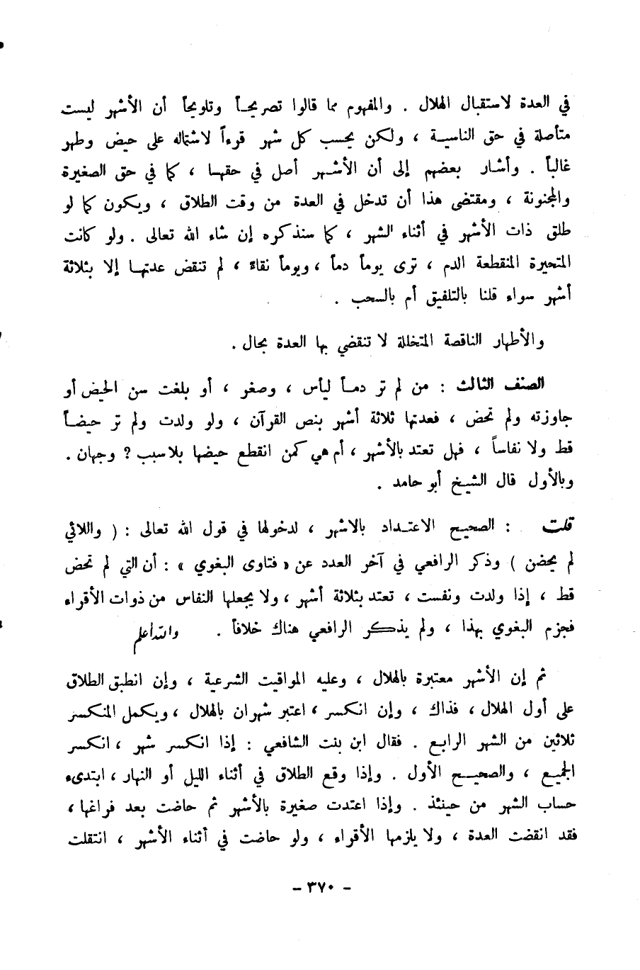 ثُمَّ إِنَّ الْأَشْهُرَ مُعْتَبَرَةٌ بِالْهِلَالِ، وَعَلَيْهِ الْمَوَاقِيتُ الشَّرْعِيَّةُ، وَإِنِ انْطَبَقَ الطَّلَاقُ عَلَى أَوَّلِ الْهِلَالِ، فَذَاكَ، وَإِنِ انْكَسَرَ، اعْتُبِرَ شَهْرَانِ بِالْهِلَالِ، وَيُكَمَّلُ الْمُنْكَسِرُ ثَلَاثِينَ مِنَ الشَّهْرِ الرَّابِعِ. فَقَالَ ابْنُ بِنْتِ الشَّافِعِيِّ: إِذَا انْكَسَرَ شَهْرٌ، انْكَسَرَ الْجَمِيعُ، وَالصَّحِيحُ الْأَوَّلُ. وَإِذَا وَقَعَ الطَّلَاقُ فِي أَثْنَاءِ اللَّيْلِ أَوِ النَّهَارِ، ابْتُدِئَ حِسَابُ الشَّهْرِ مِنْ حِينَئِذٍ. وَإِذَا اعْتَدَّتْ صَغِيرَةٌ بِالْأَشْهُرِ ثُمَّ حَاضَتْ بَعْدَ فَرَاغِهَا، فَقَدِ انْقَضَتِ الْعِدَّةُ، وَلَا يَلْزَمُهَا الْأَقْرَاءُ، وَلَوْ حَاضَتْ فِي أَثْنَاءِ الْأَشْهُرِ، انْتَقَلَتْ