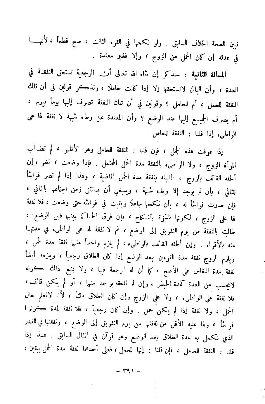 الْمَسْأَلَةُ الثَّانِيَةُ: سَنَذْكُرُ إِنْ شَاءَ اللَّهُ تَعَالَى أَنَّ الرَّجْعِيَّةَ تَسْتَحِقُّ النَّفَقَةَ فِي الْعِدَّةِ، وَأَنَّ الْبَائِنَ لَا تَسْتَحِقُّهَا إِلَّا إِذَا كَانَتْ حَامِلًا، وَنَذْكُرُ قَوْلَيْنِ فِي أَنَّ تِلْكَ النَّفَقَةَ لِلْحَمْلِ، أَمْ لِلْحَامِلِ؟ وَقَوْلَيْنِ فِي أَنَّ تِلْكَ النَّفَقَةَ تُصْرَفُ إِلَيْهَا يَوْمًا بِيَوْمٍ، أَمْ يُصْرَفُ الْجَمِيعُ إِلَيْهَا عِنْدَ الْوَضْعِ؟ وَأَنَّ الْمُعْتَدَّةَ عَنْ وَطْءِ شُبْهَةٍ لَا نَفَقَةَ لَهَا عَلَى الْوَاطِئِ إِذَا قُلْنَا: النَّفَقَةُ لِلْحَامِلِ.